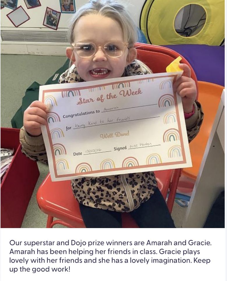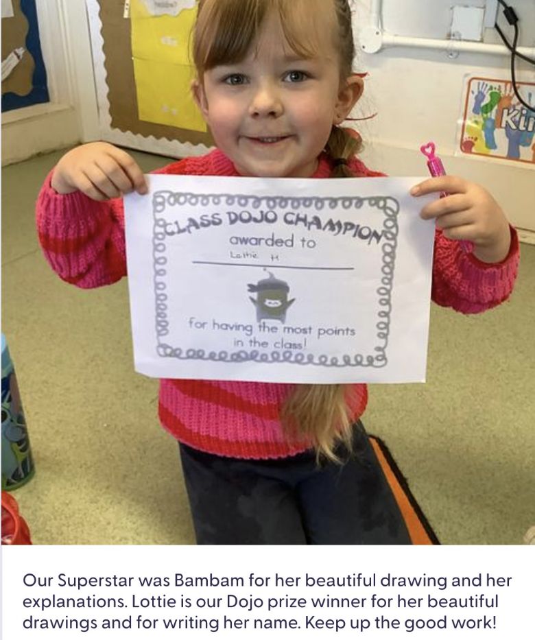 Our superstar and Dojo prize winners are Thomas and Toby. Thomas has created very detailed drawings of his favourite characters, and he has been writing letters and numbers. Toby follows the class routine well and is always helpful. Keep up the good work! 28.11.25
