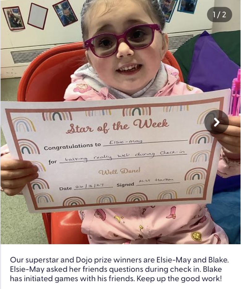 Our superstar and Dojo prize winners 05.12.25. Myla is our superstar for using lots of lovely language, whilst talking about her elf at home.