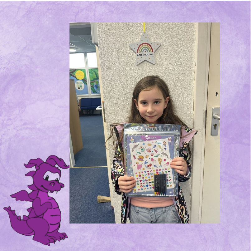 Each week, when pupils are awarded 'Purple Rhodri' in class they are entered into the weekly raffle. Mrs Lecrass draws the raffle every Friday afternoon, and the winner gets to choose a prize from her special prize box.