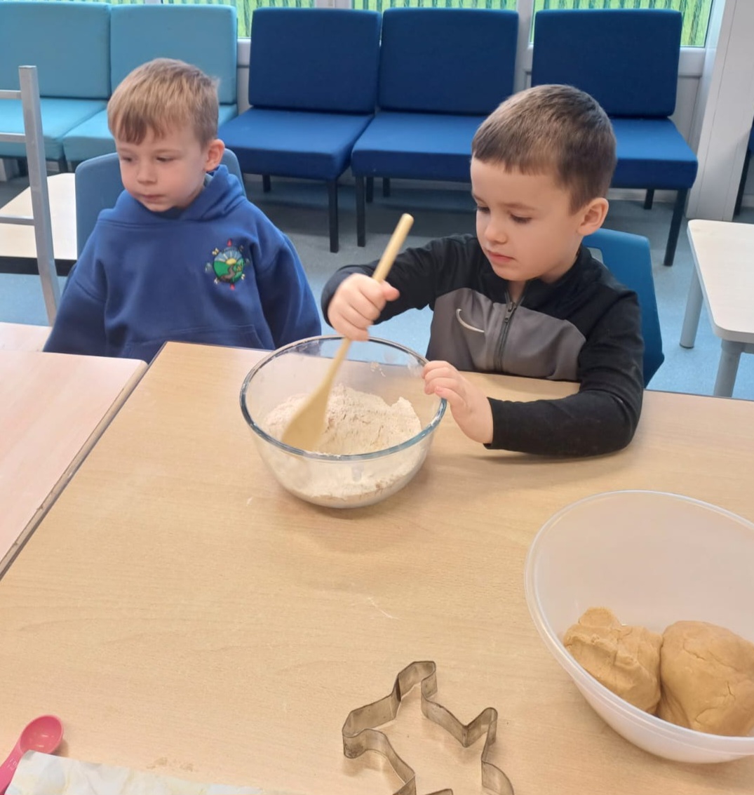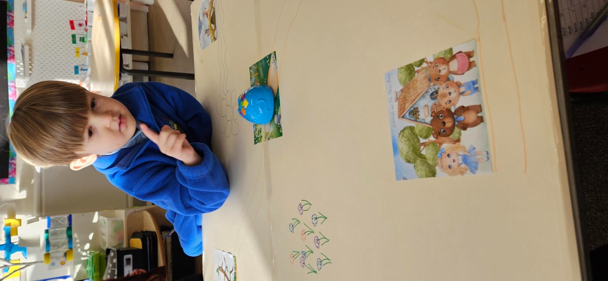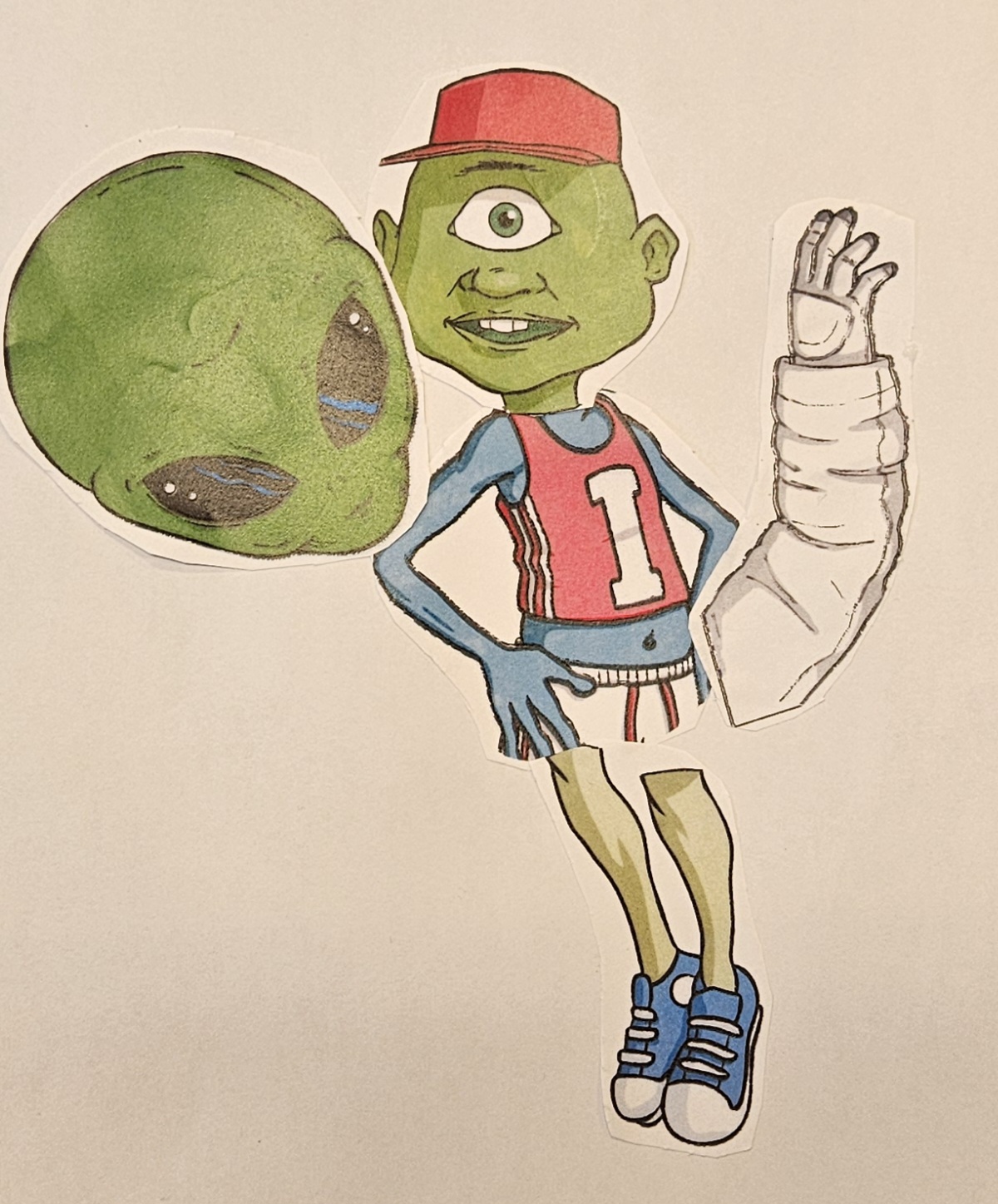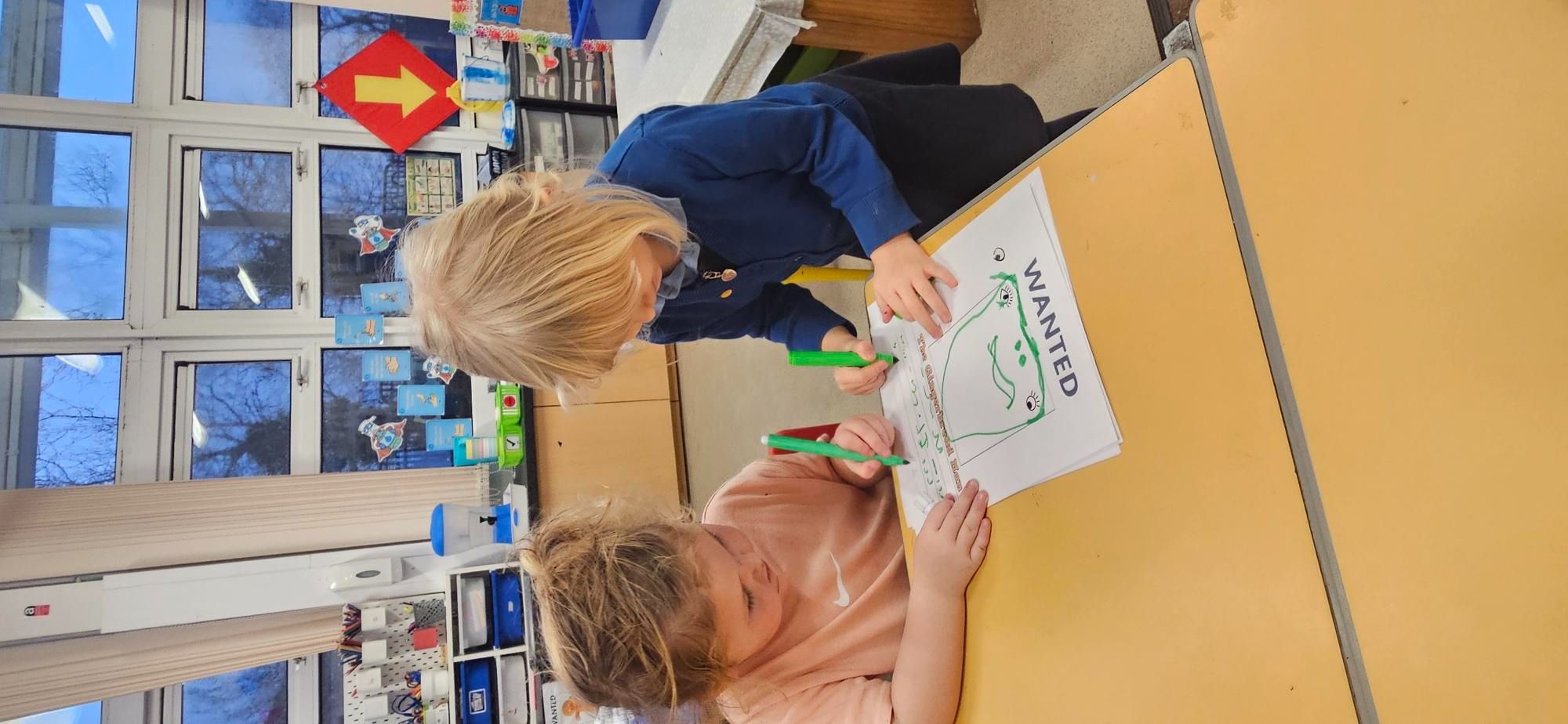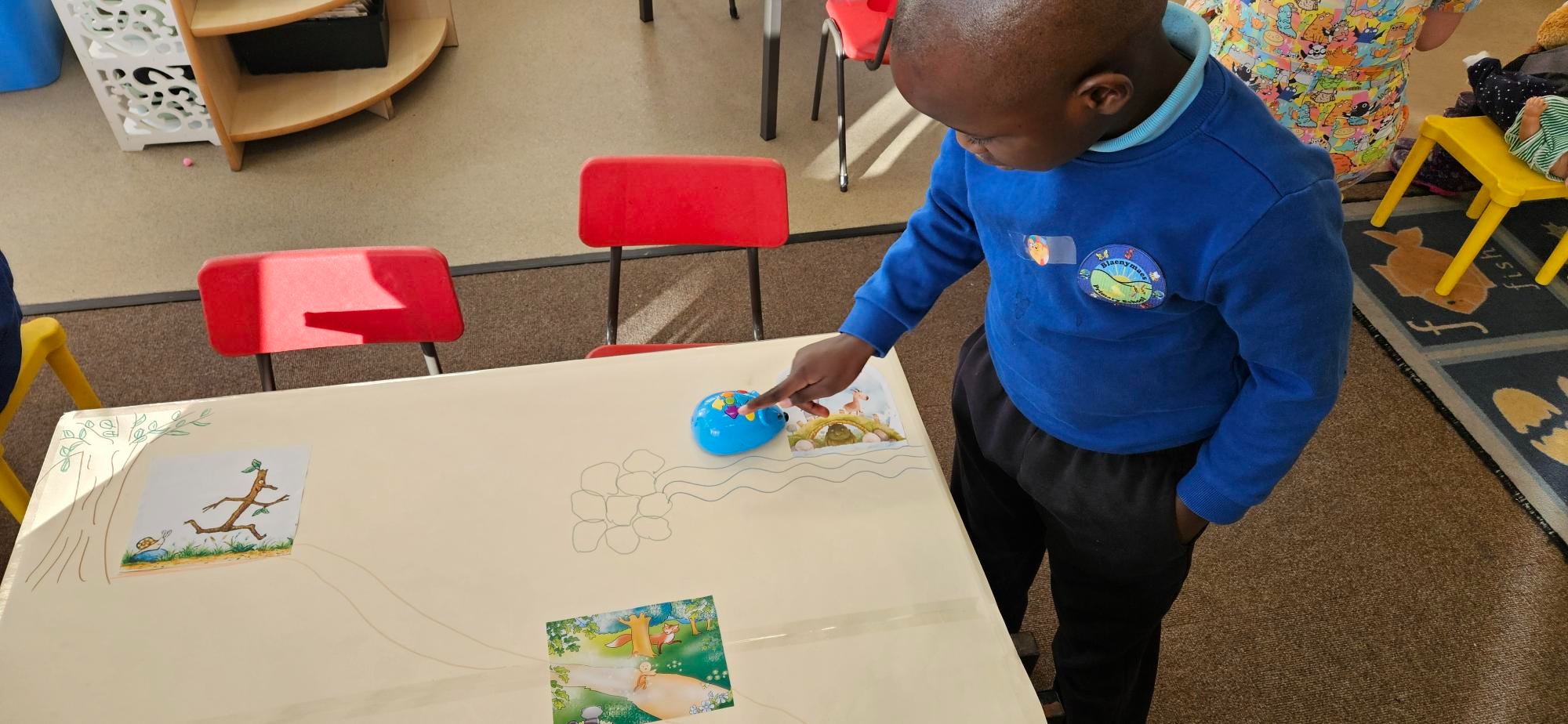 The story was about a little boy who helped the aliens. We practised our cutting and sticking skills to make our own alien characters.