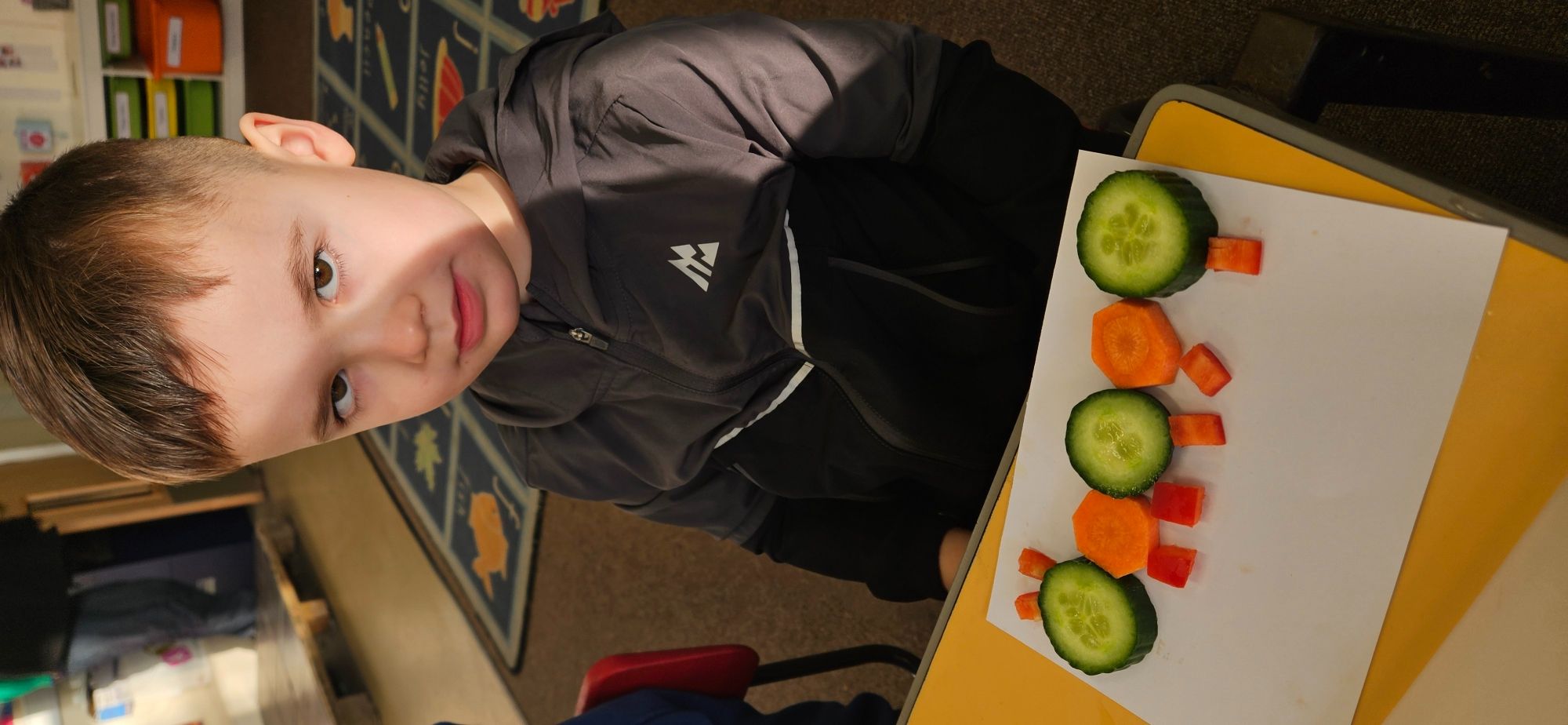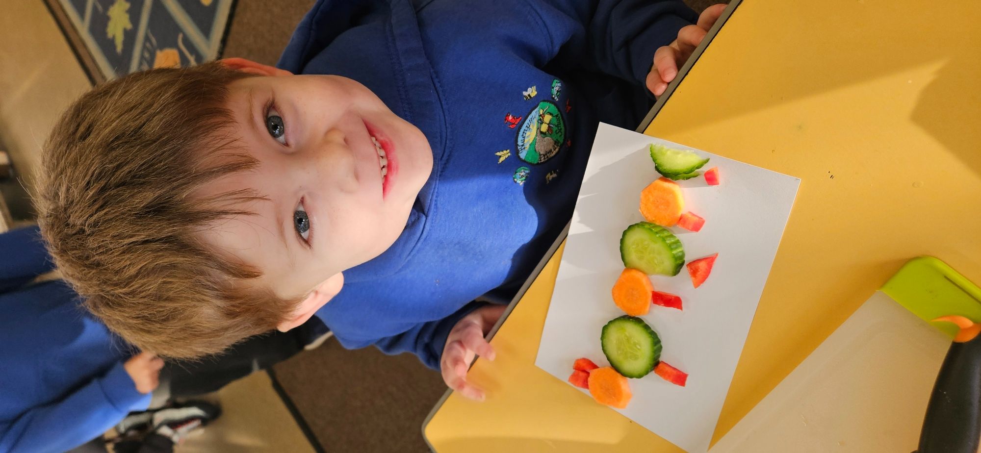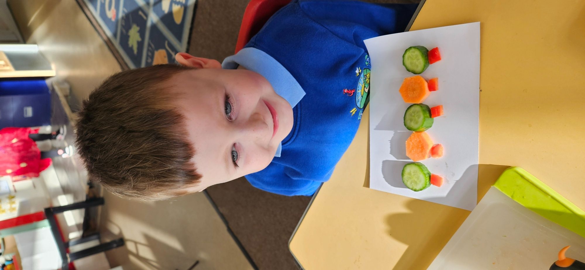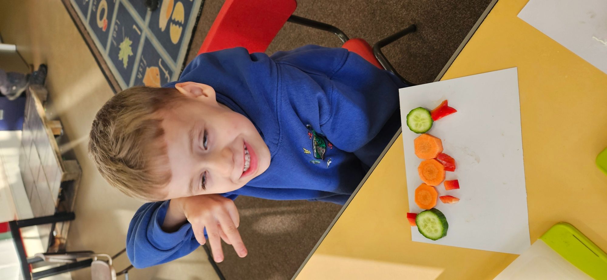 We then made a healthy snack making a caterpillar with carrot, cucumber and peppers. We tried making a pattern with the carrot and cucumber to make the body.