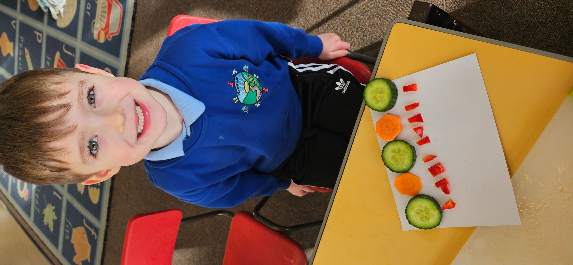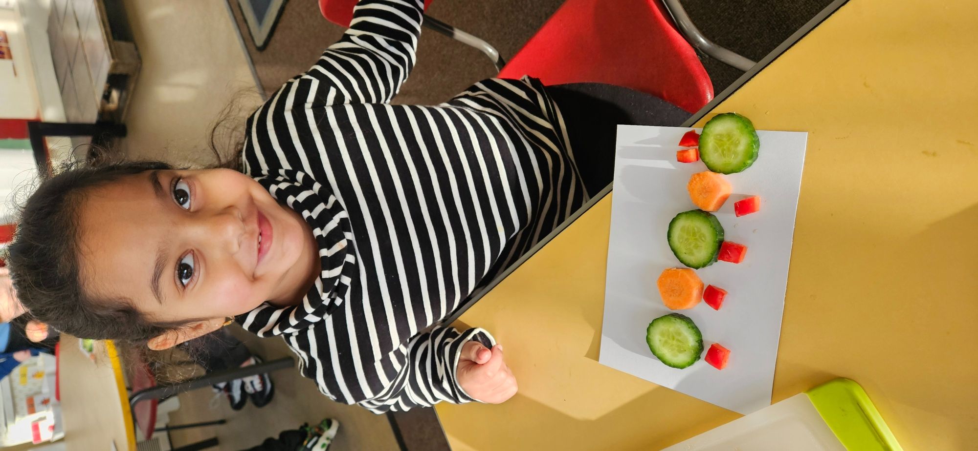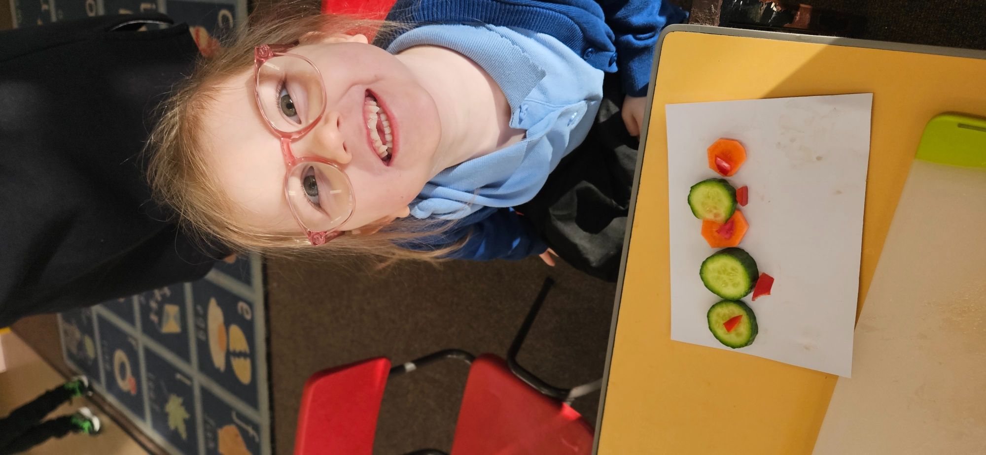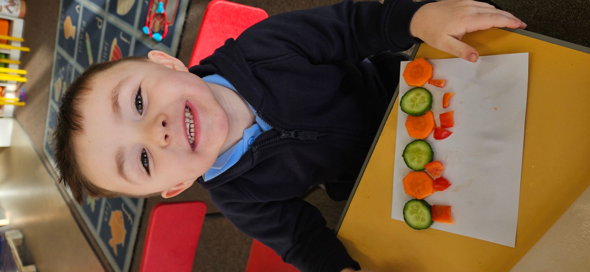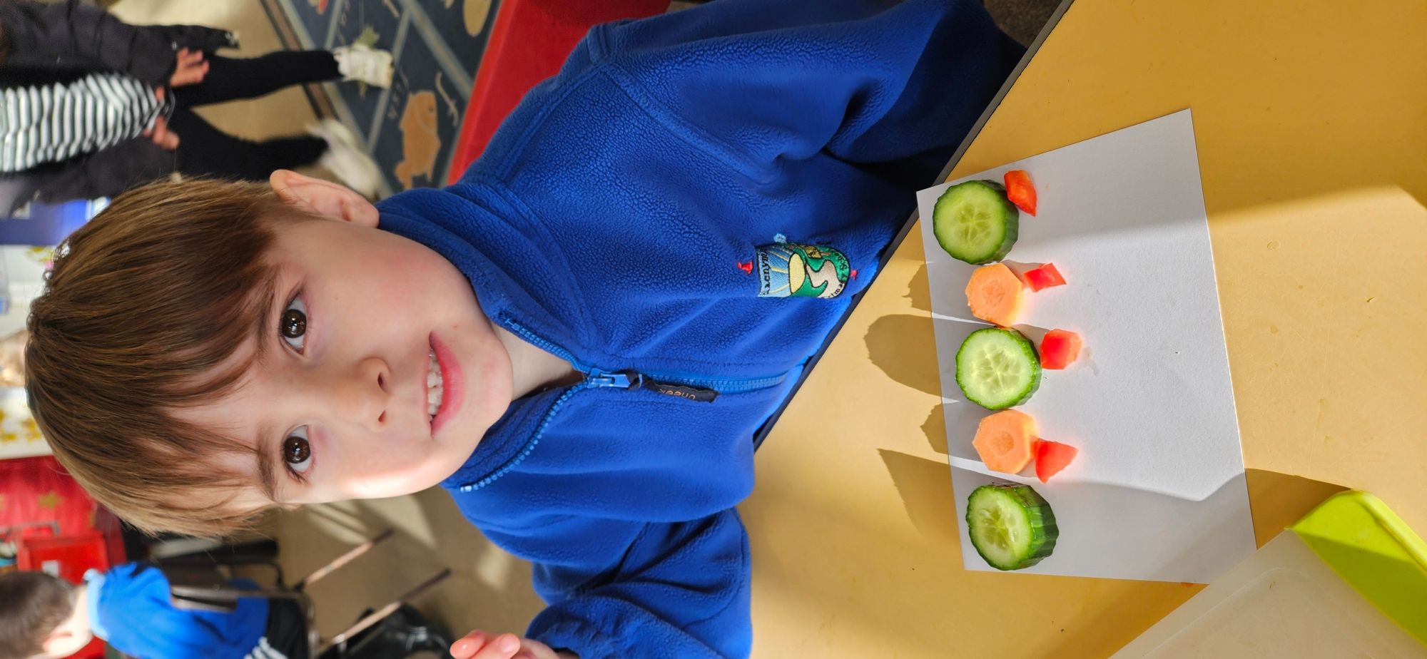 We then made a healthy snack making a caterpillar with carrot, cucumber and peppers. We tried making a pattern with the carrot and cucumber to make the body.