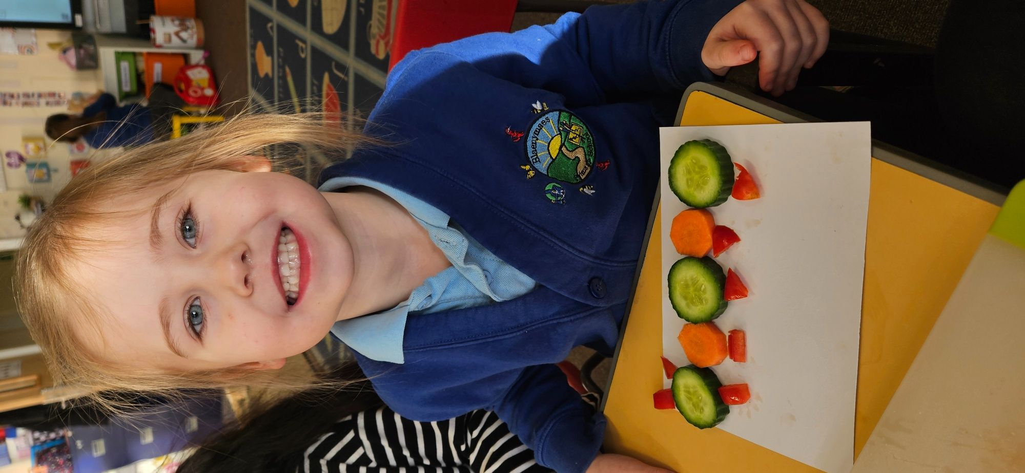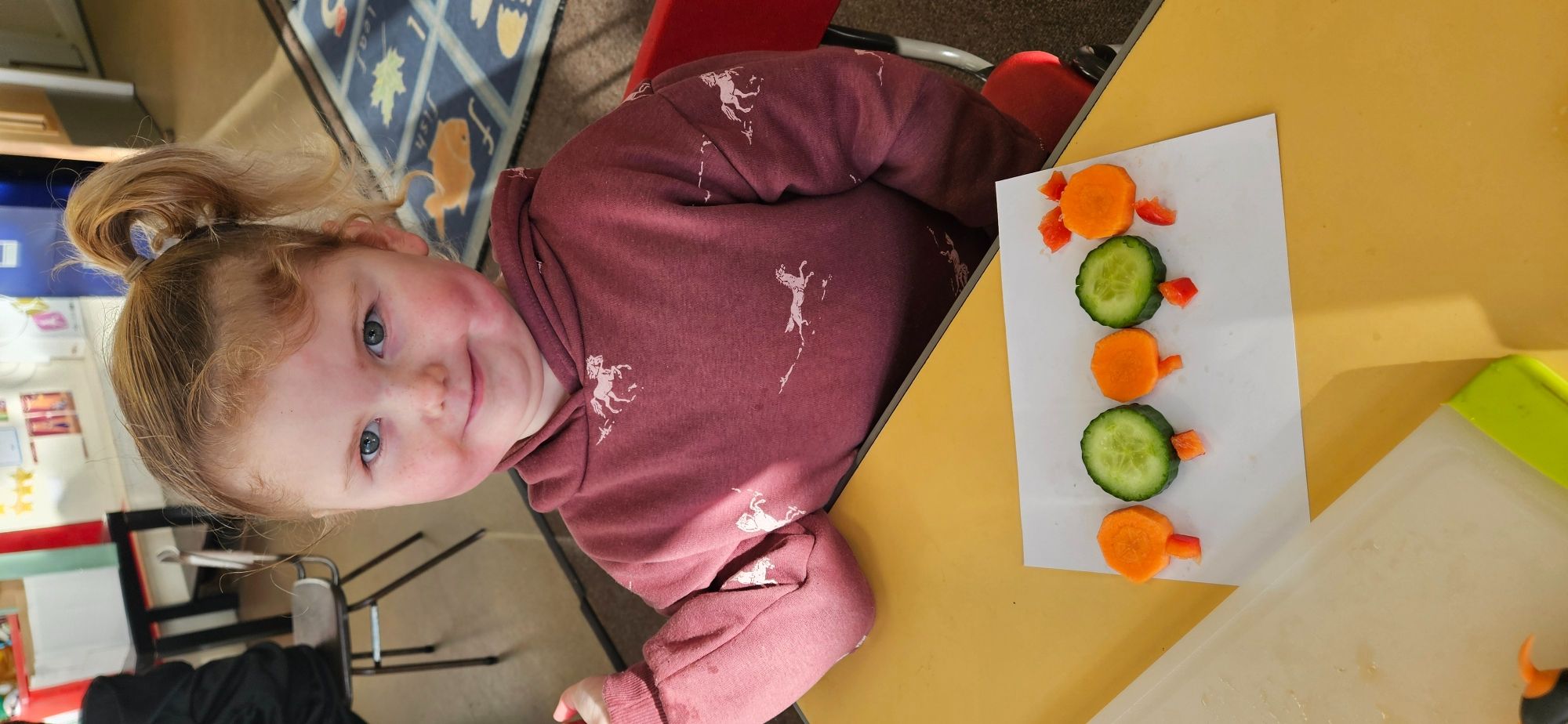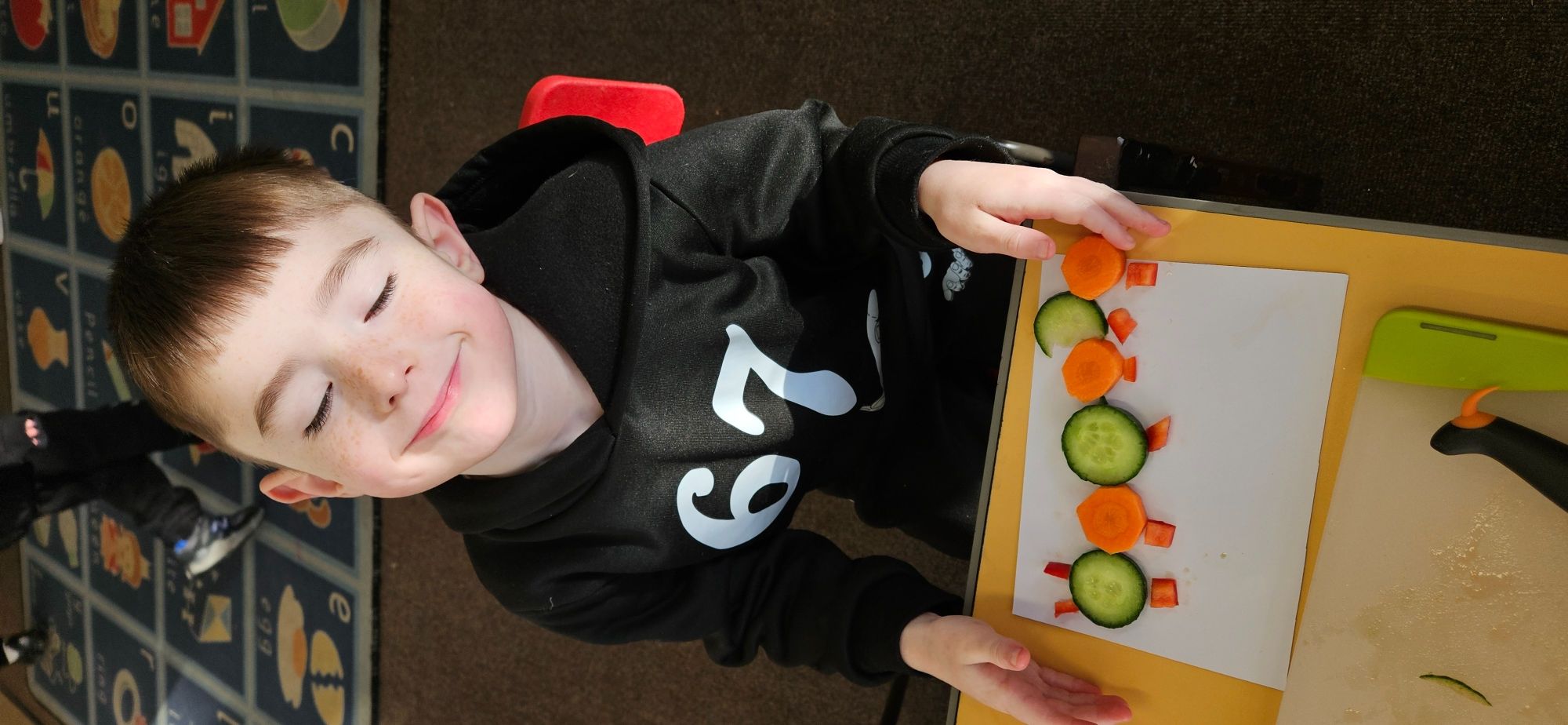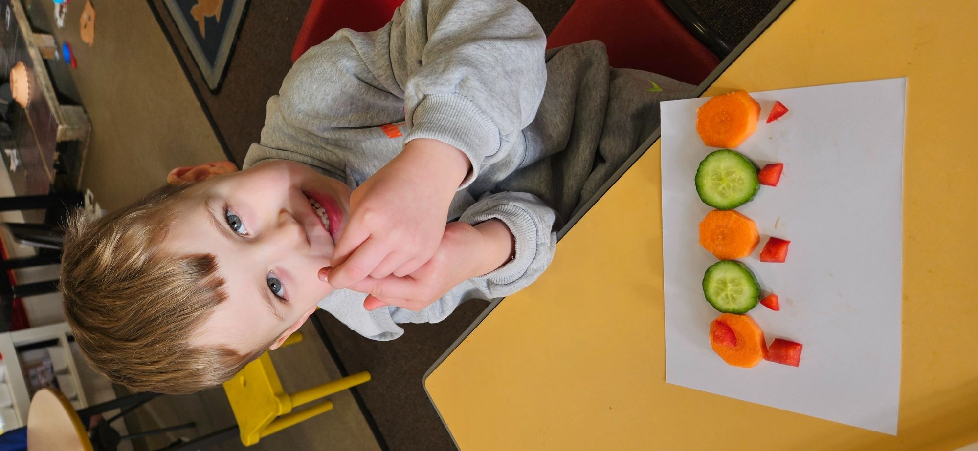 We then made a healthy snack making a caterpillar with carrot, cucumber and peppers. We tried making a pattern with the carrot and cucumber to make the body.