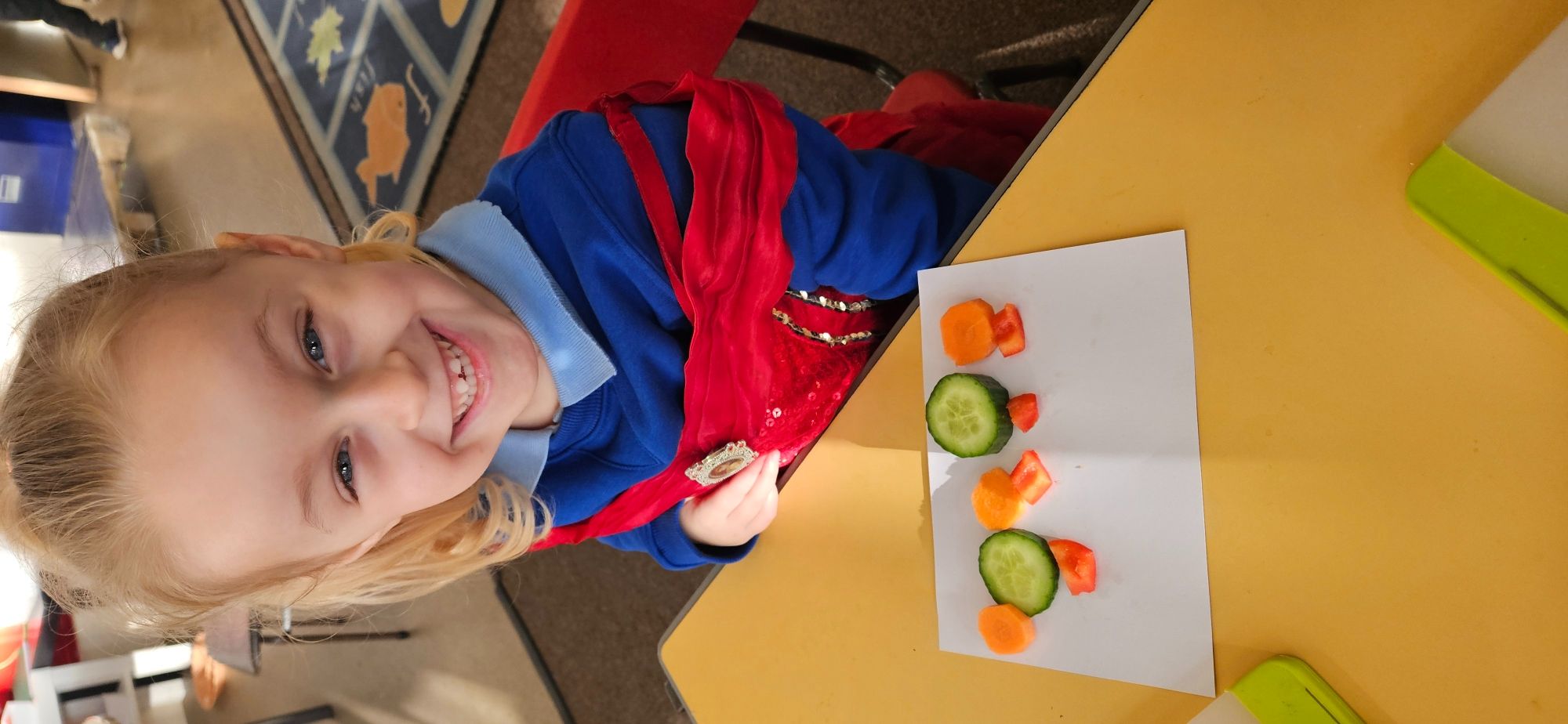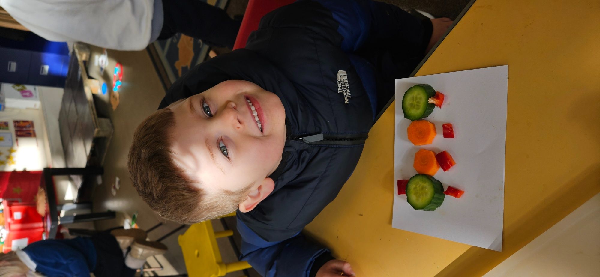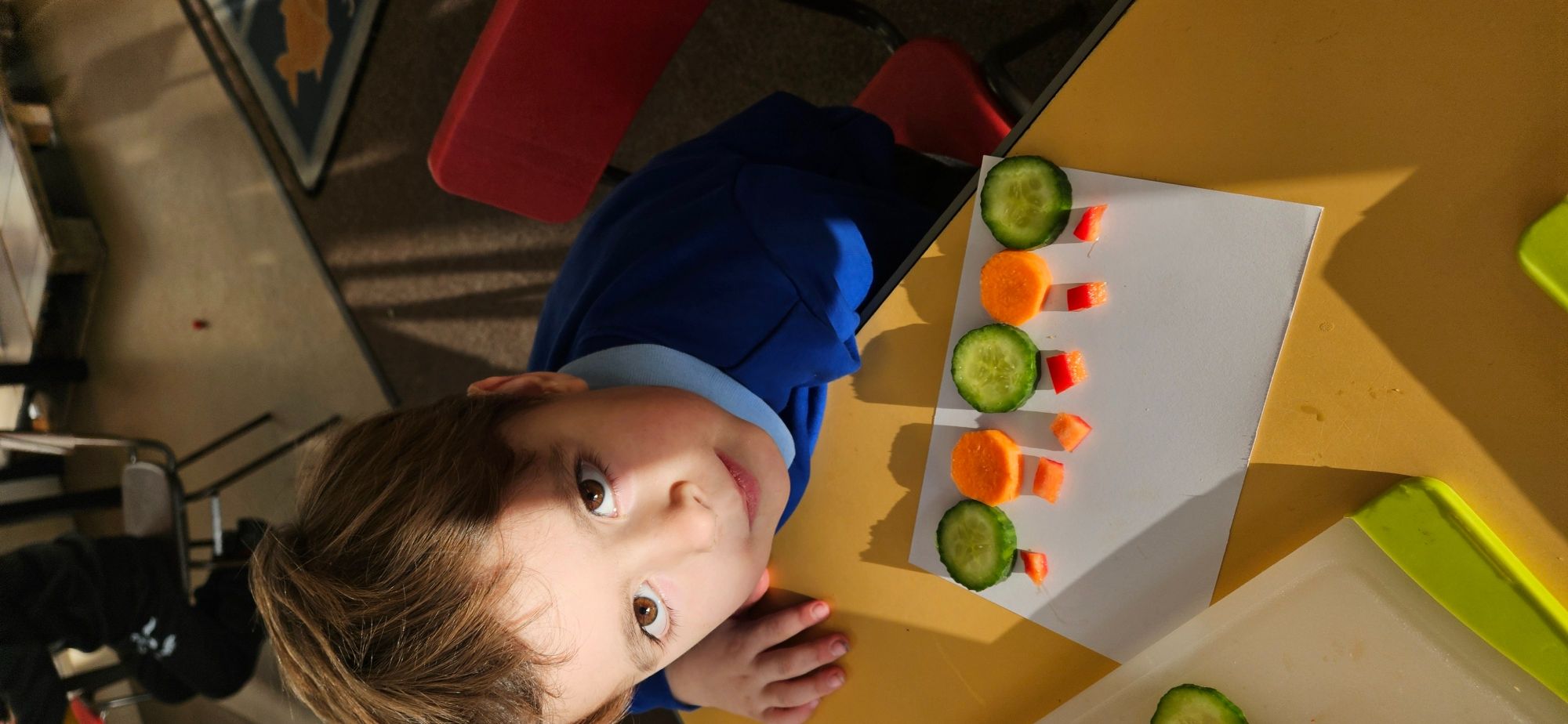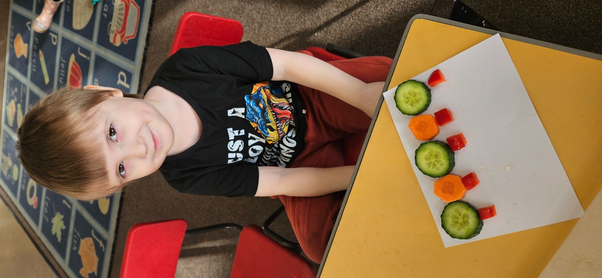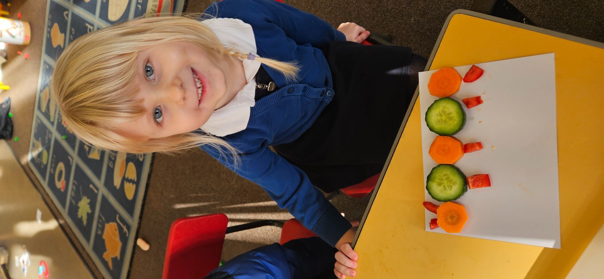 We then made a healthy snack making a caterpillar with carrot, cucumber and peppers. We tried making a pattern with the carrot and cucumber to make the body.