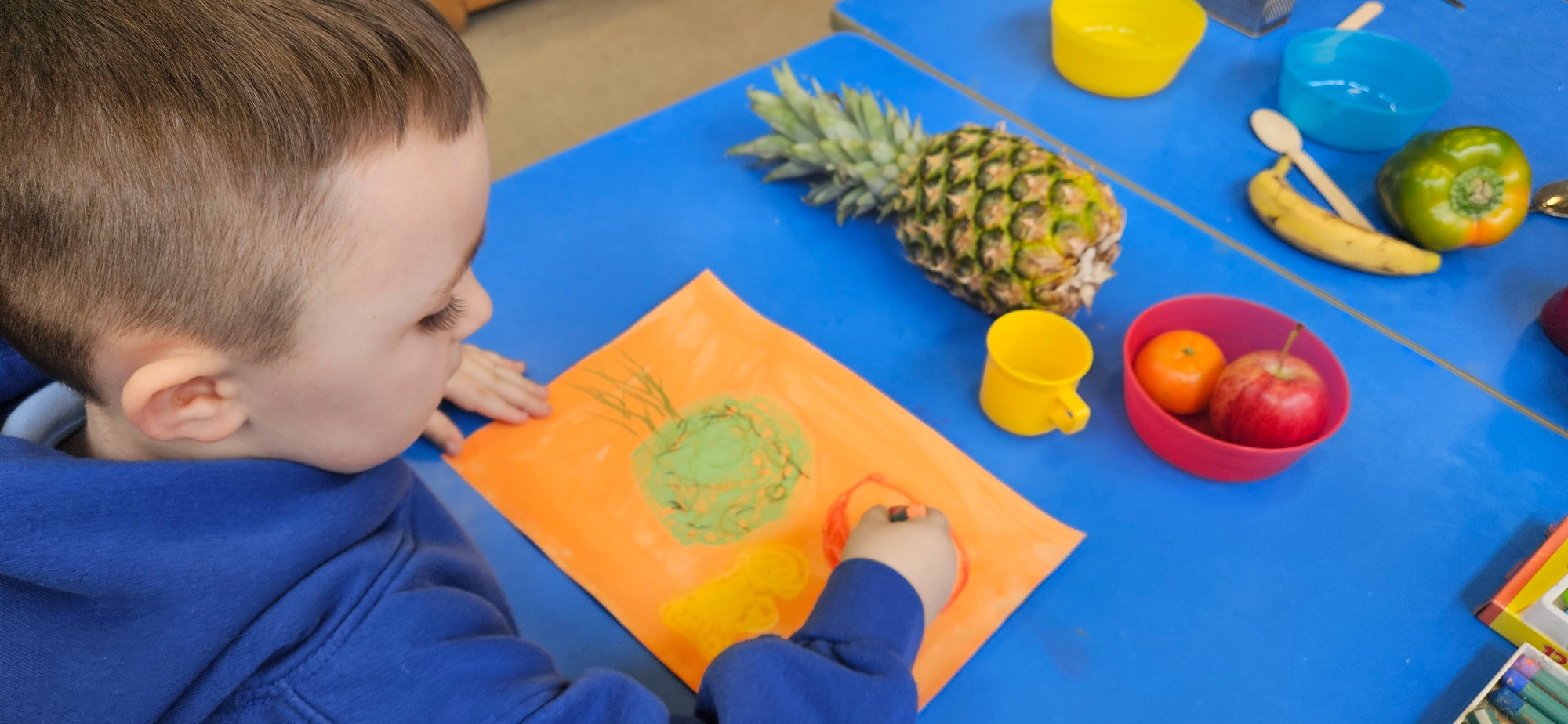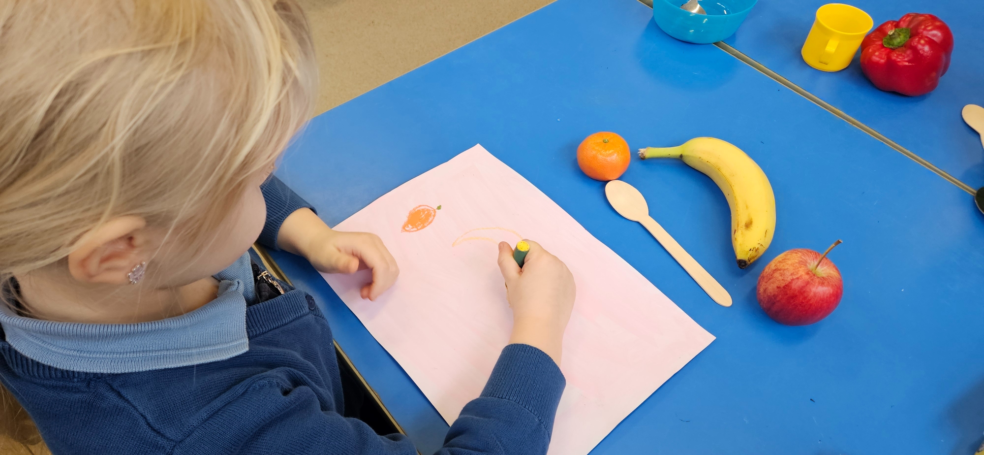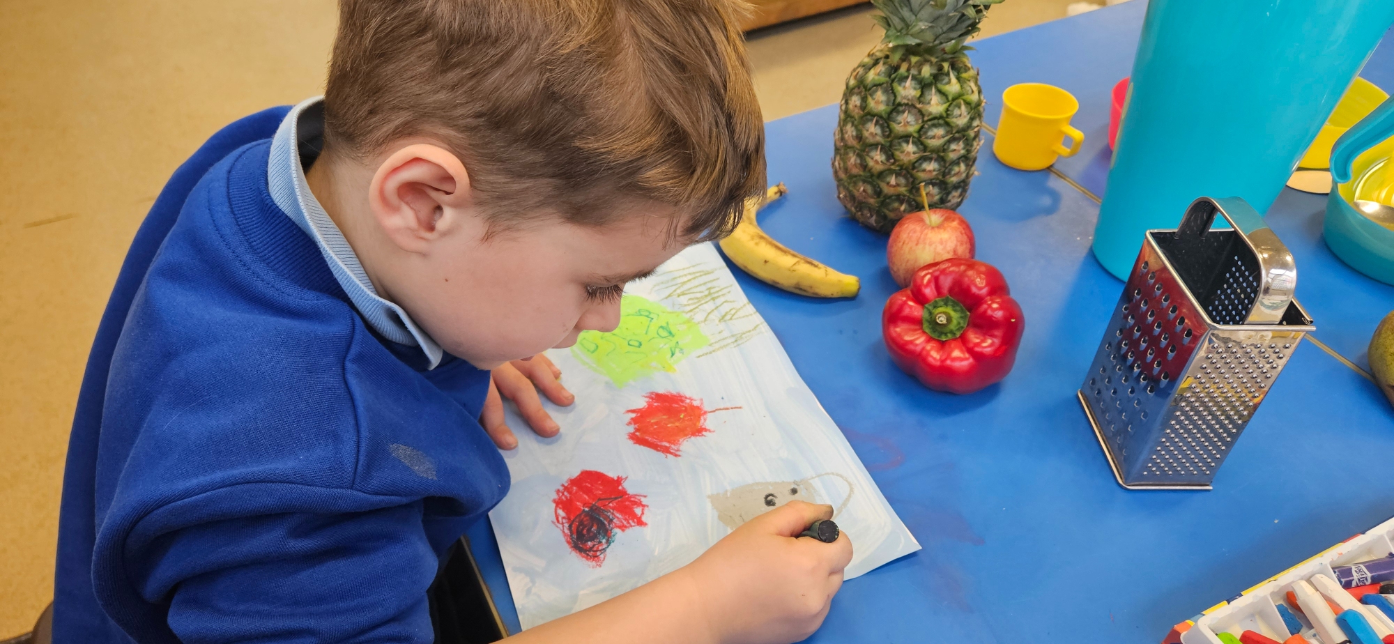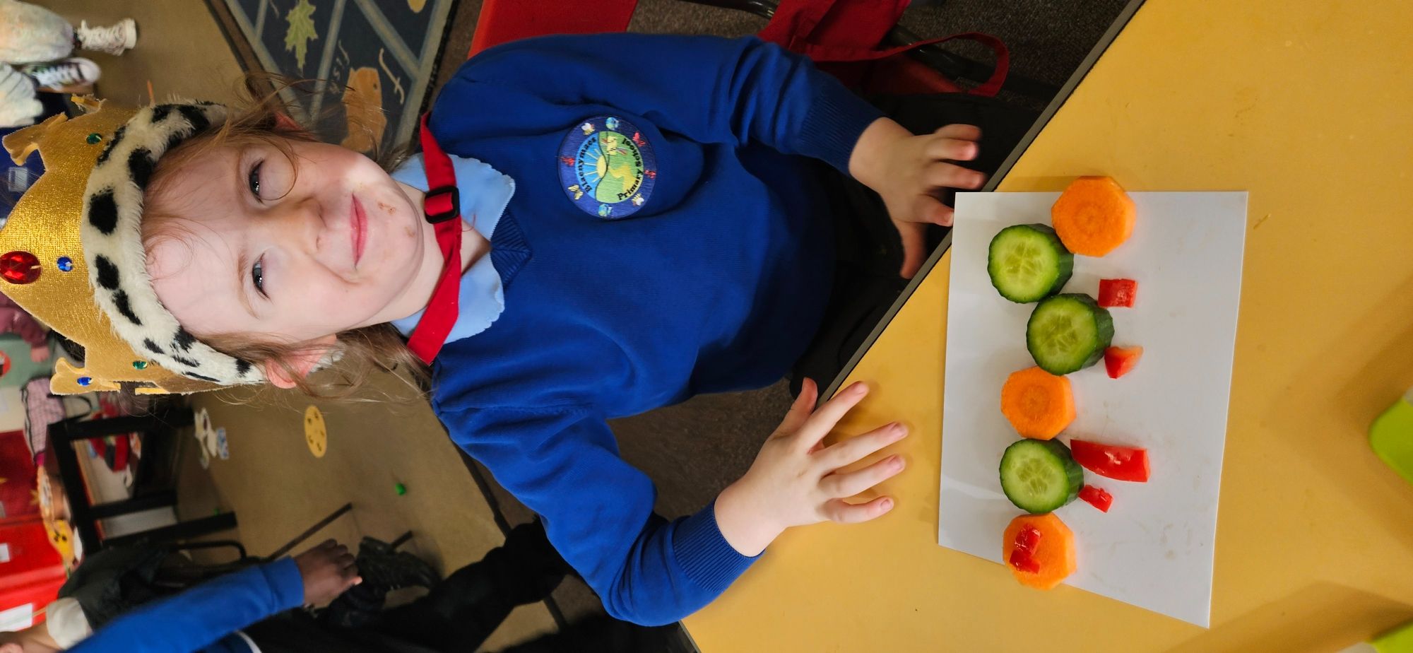We then made a healthy snack making a caterpillar with carrot, cucumber and peppers. We tried making a pattern with the carrot and cucumber to make the body.