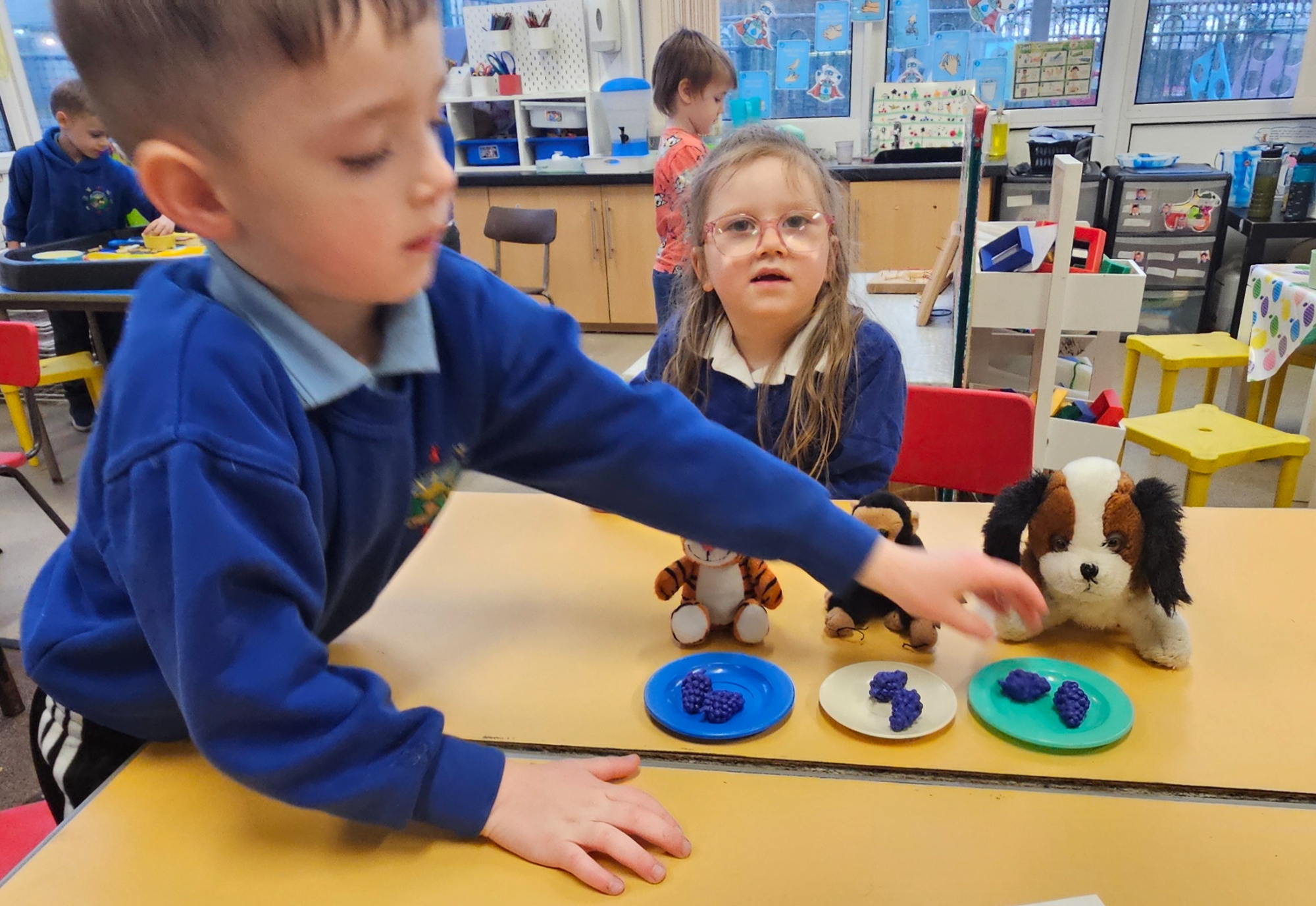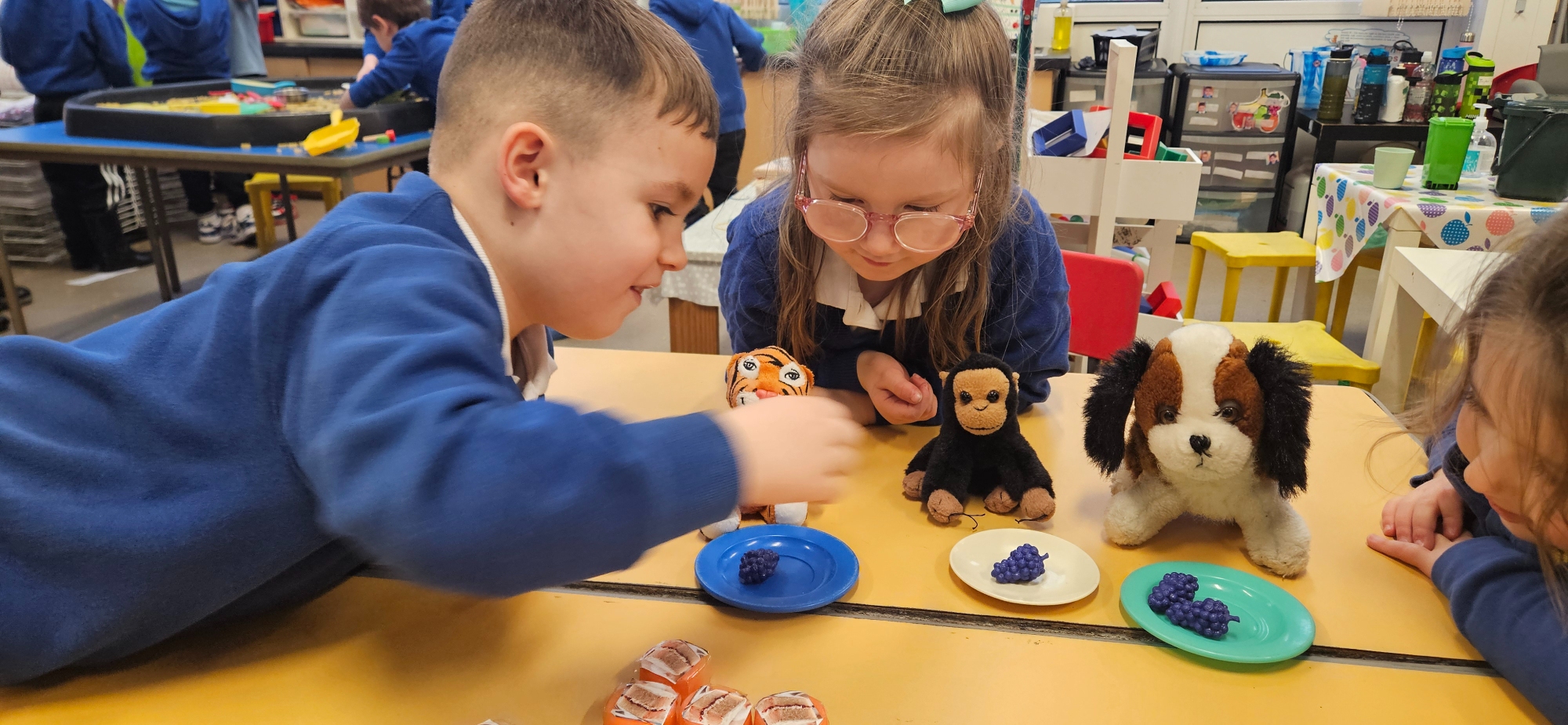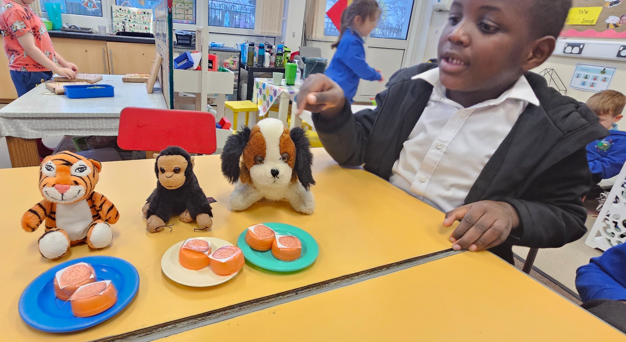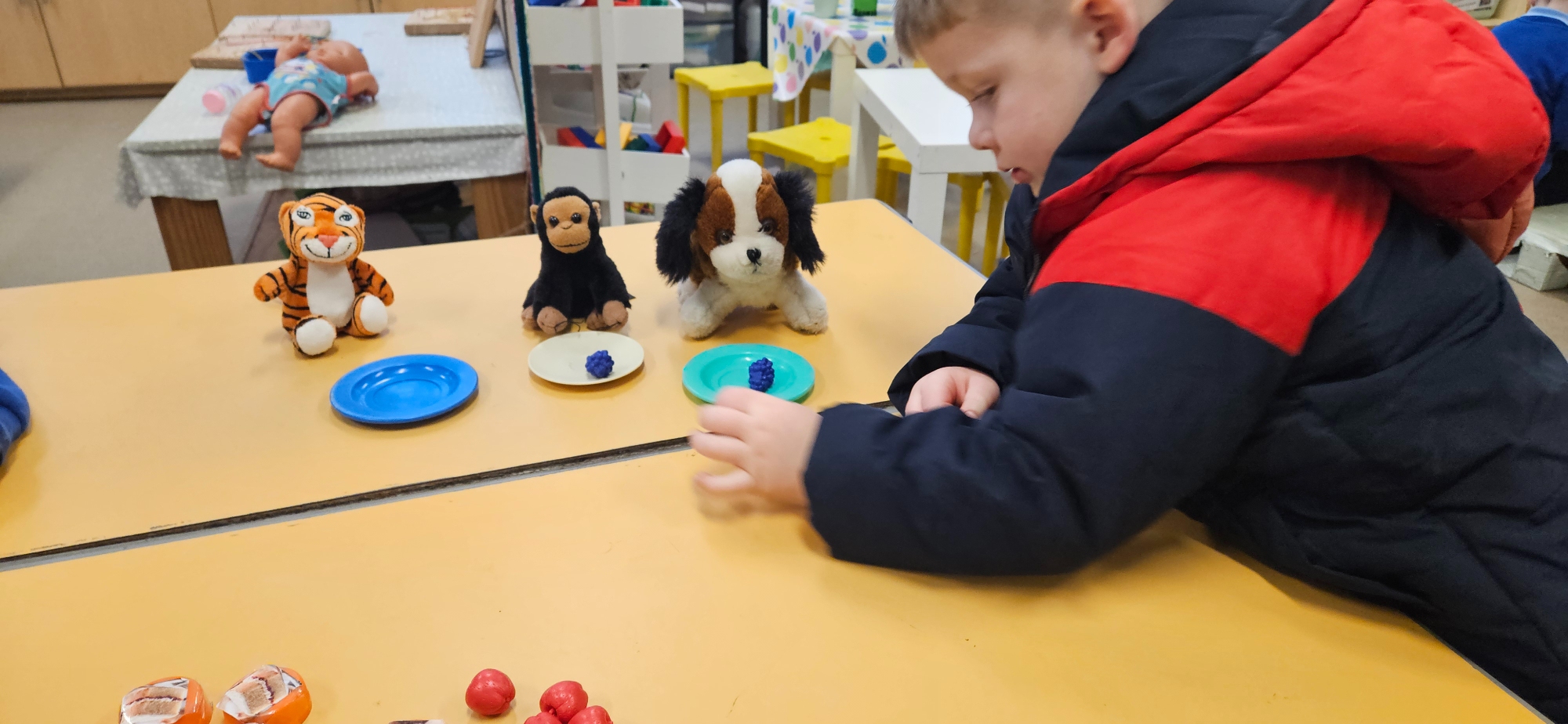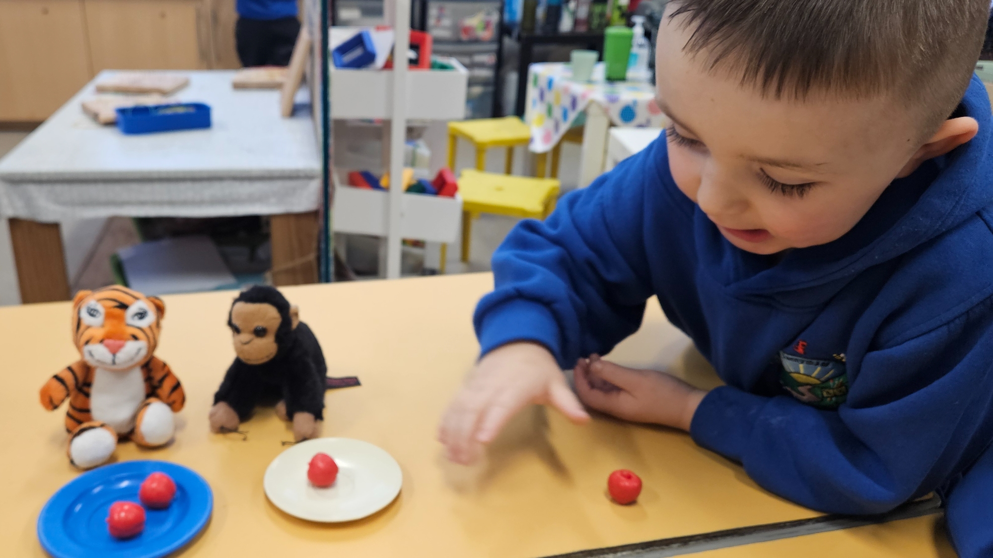 We read "The Tiger Who Came To Tea" and set up a tea party for the cuddly toys. We had to share the food so that it was equal.