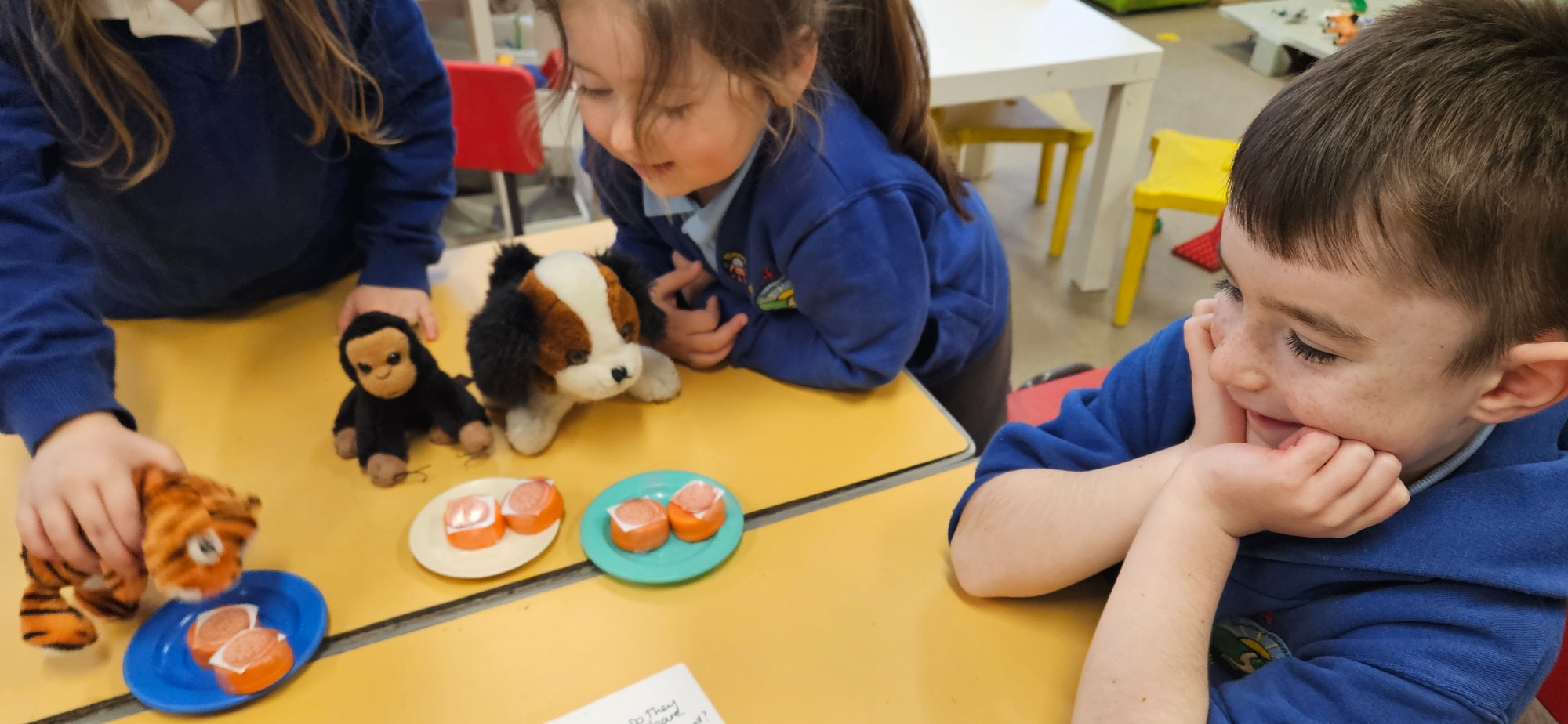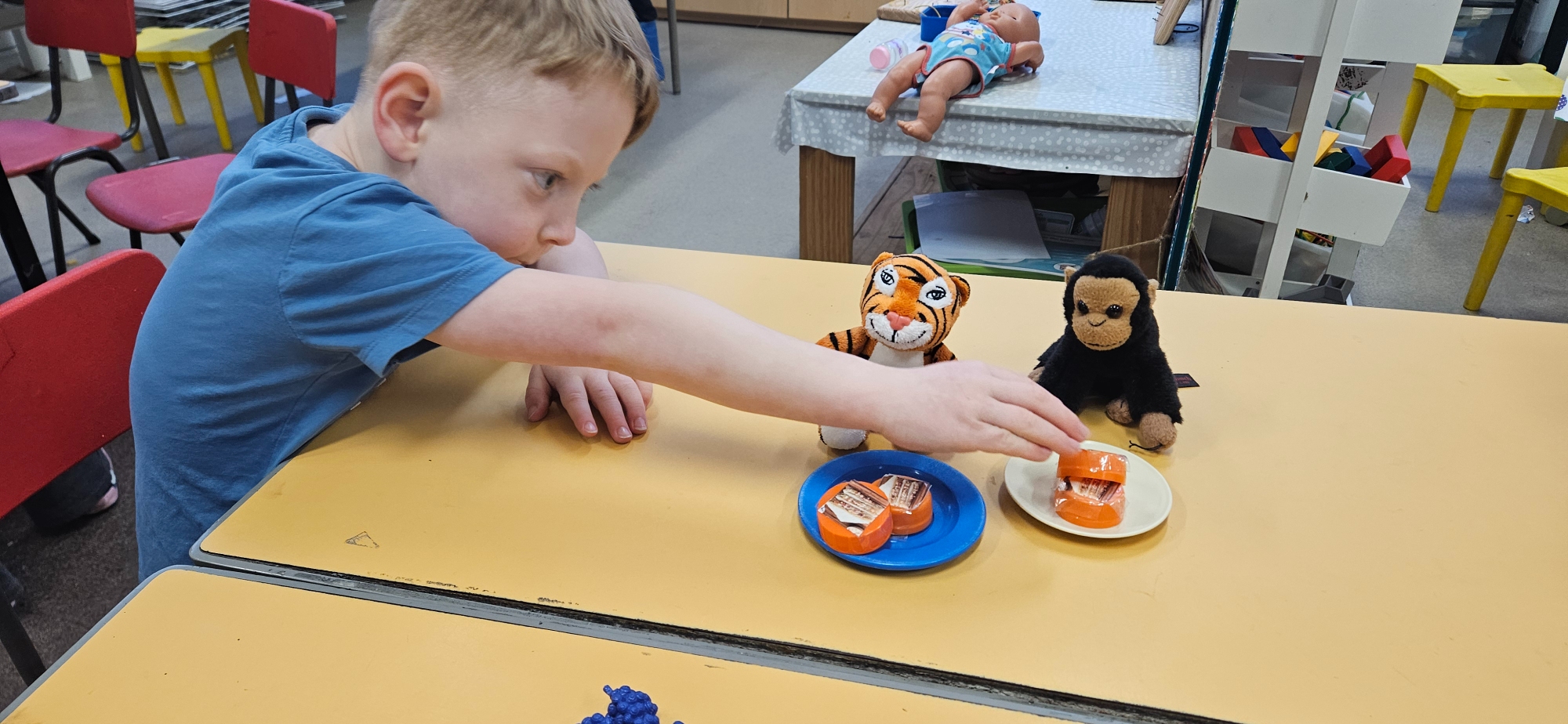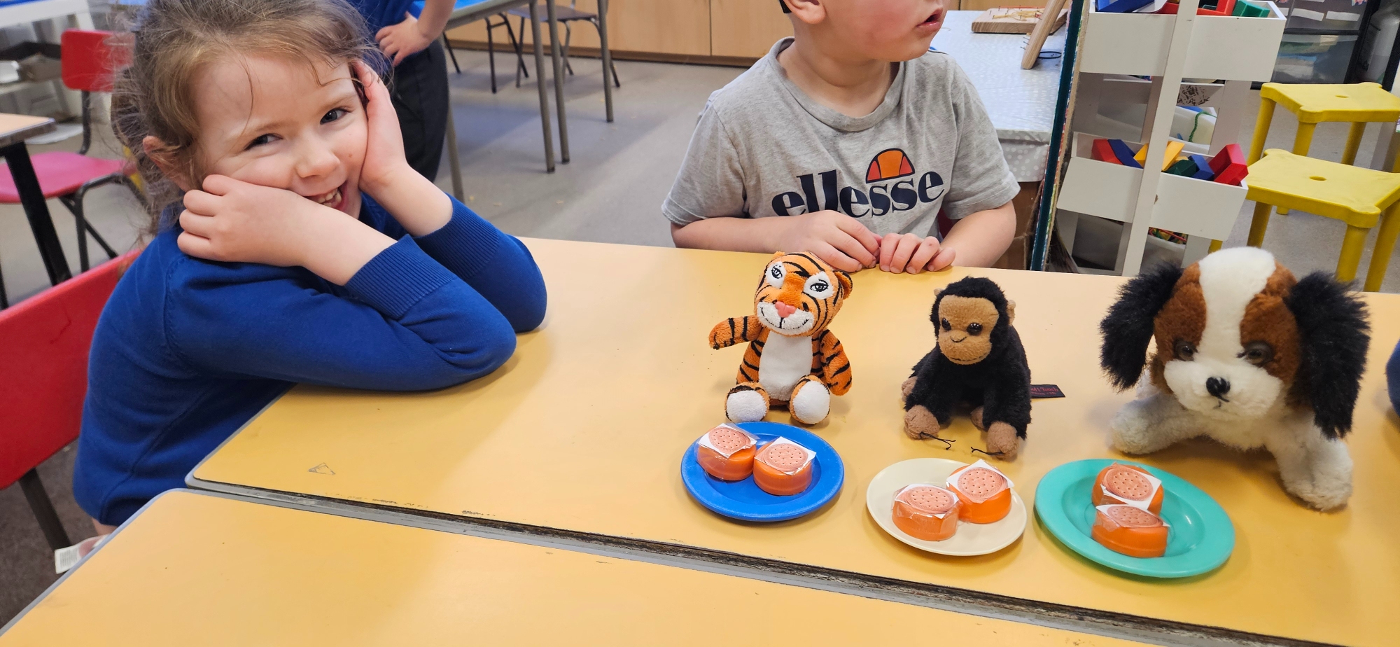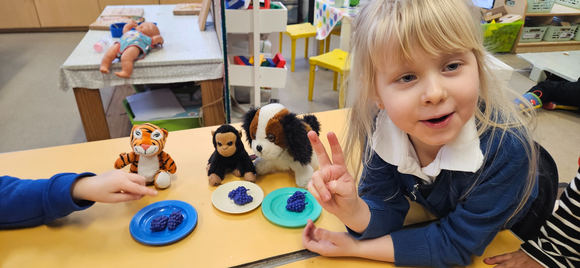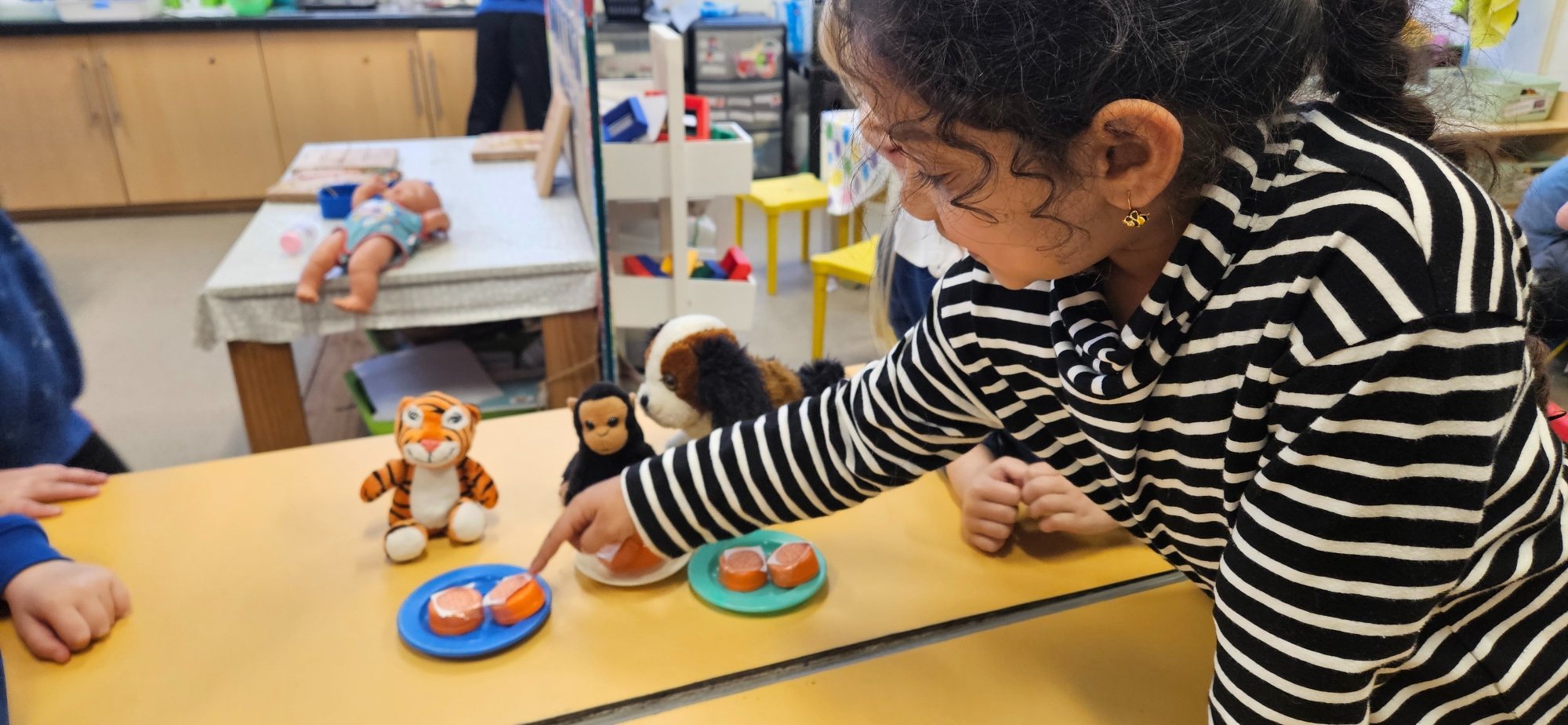 We read "The Tiger Who Came To Tea" and set up a tea party for the cuddly toys. We had to share the food so that it was equal.