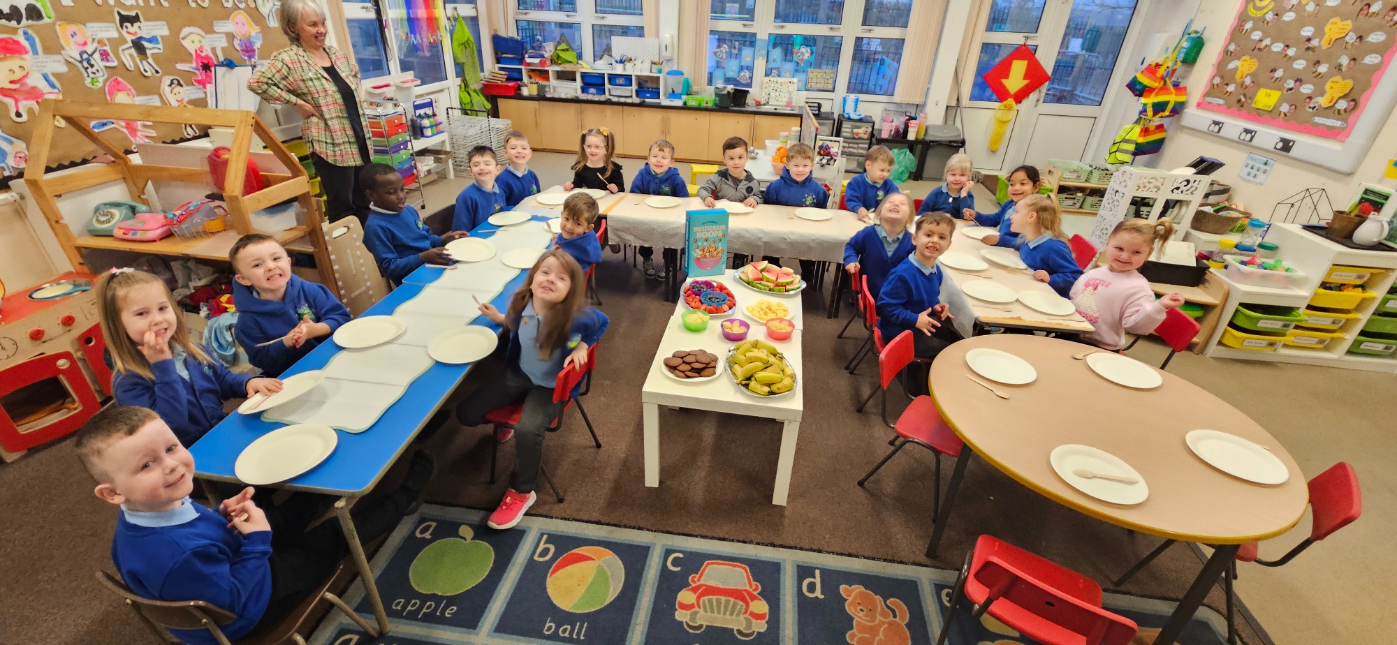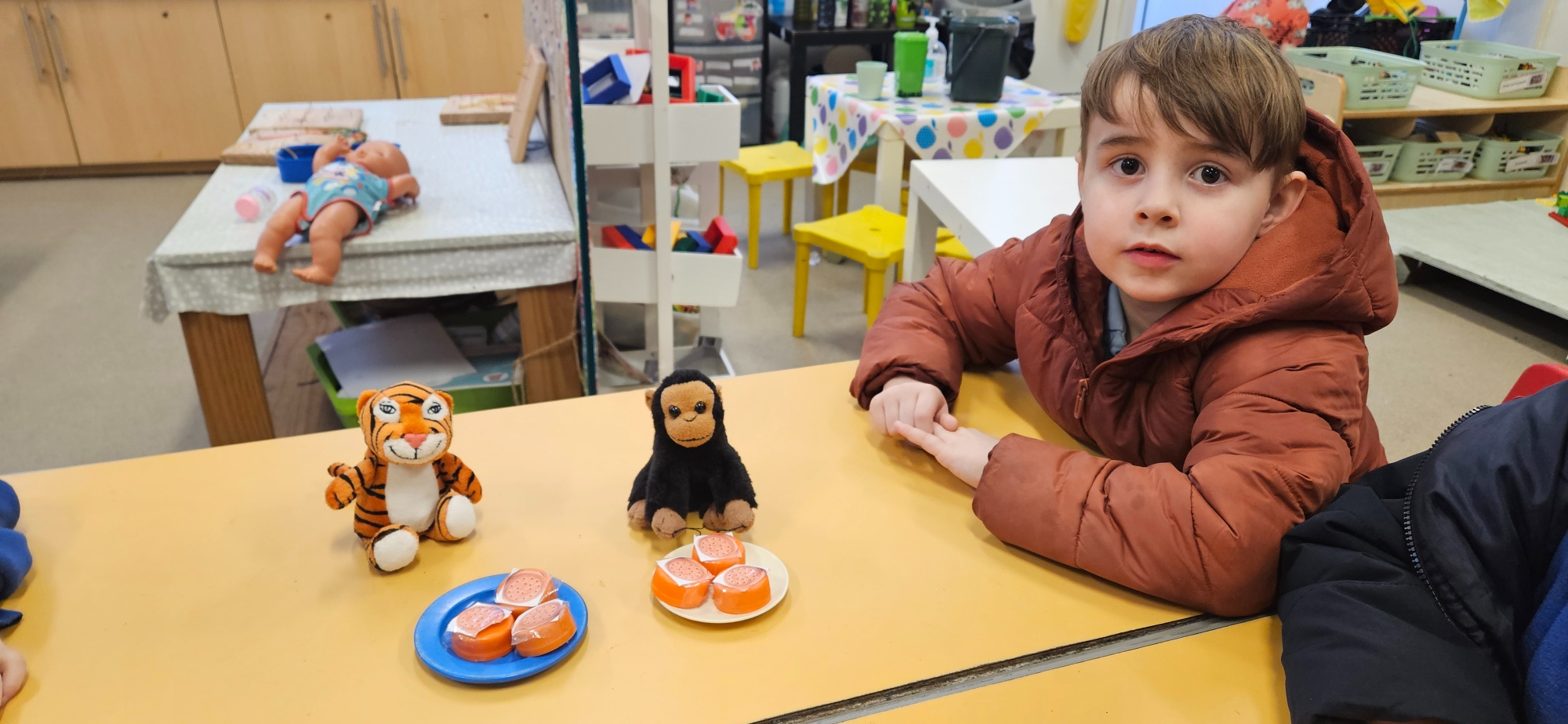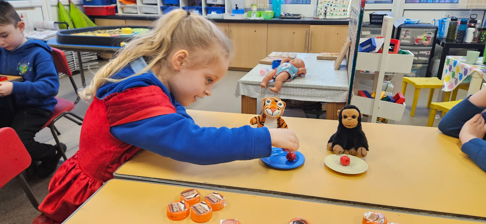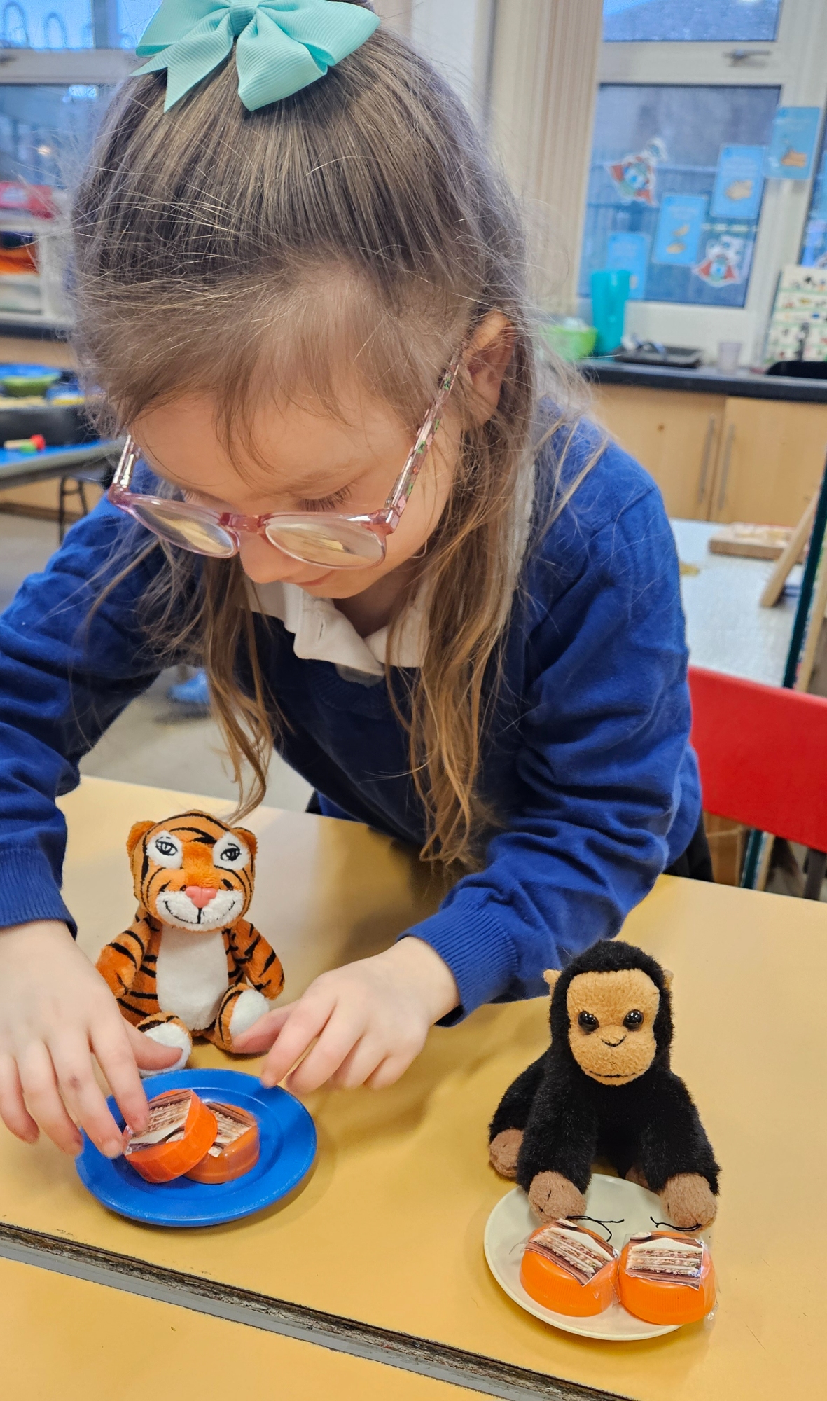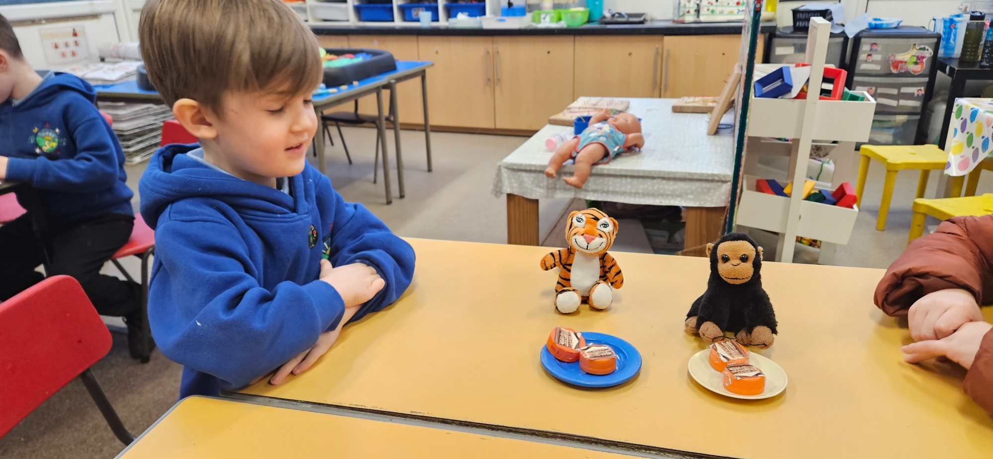 We read "The Tiger Who Came To Tea" and set up a tea party for the cuddly toys. We had to share the food so that it was equal.