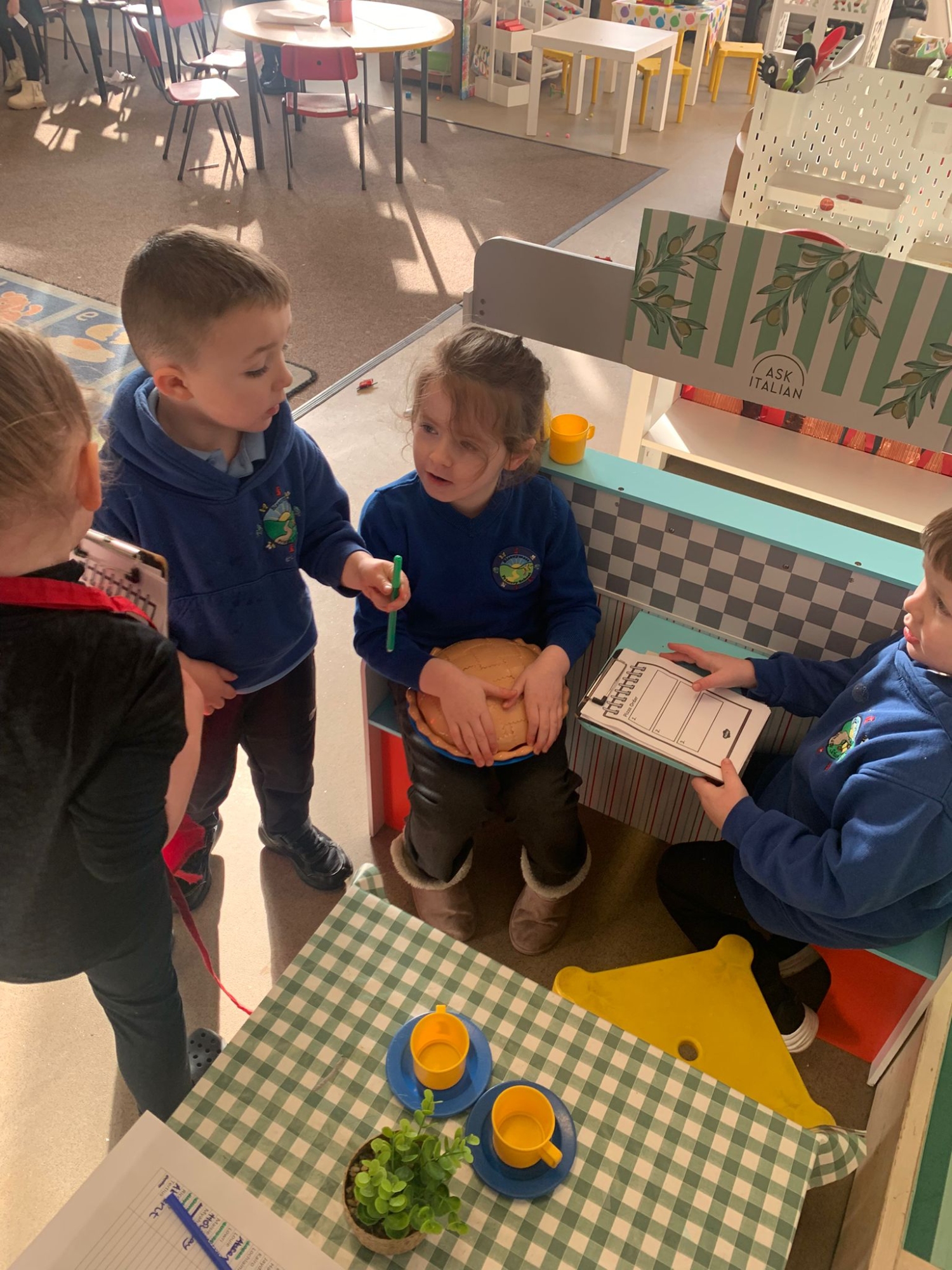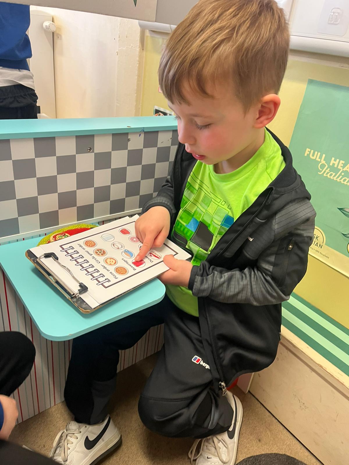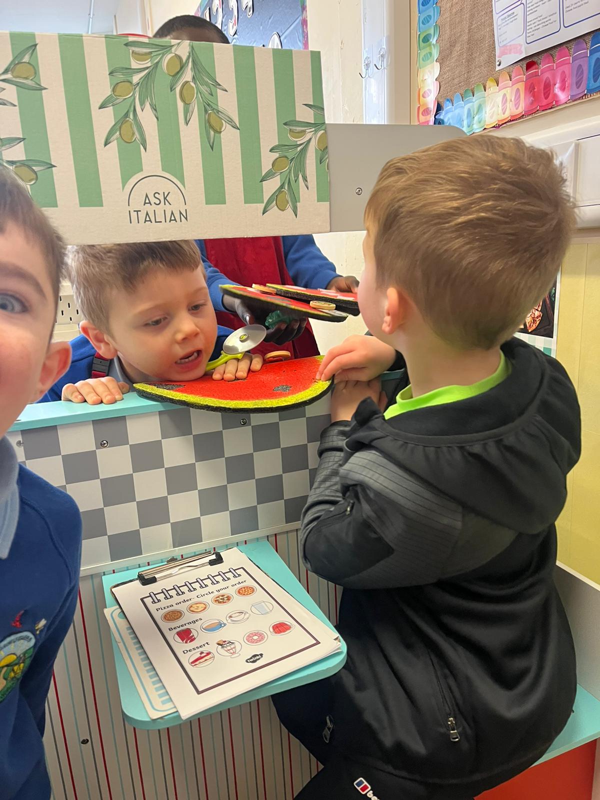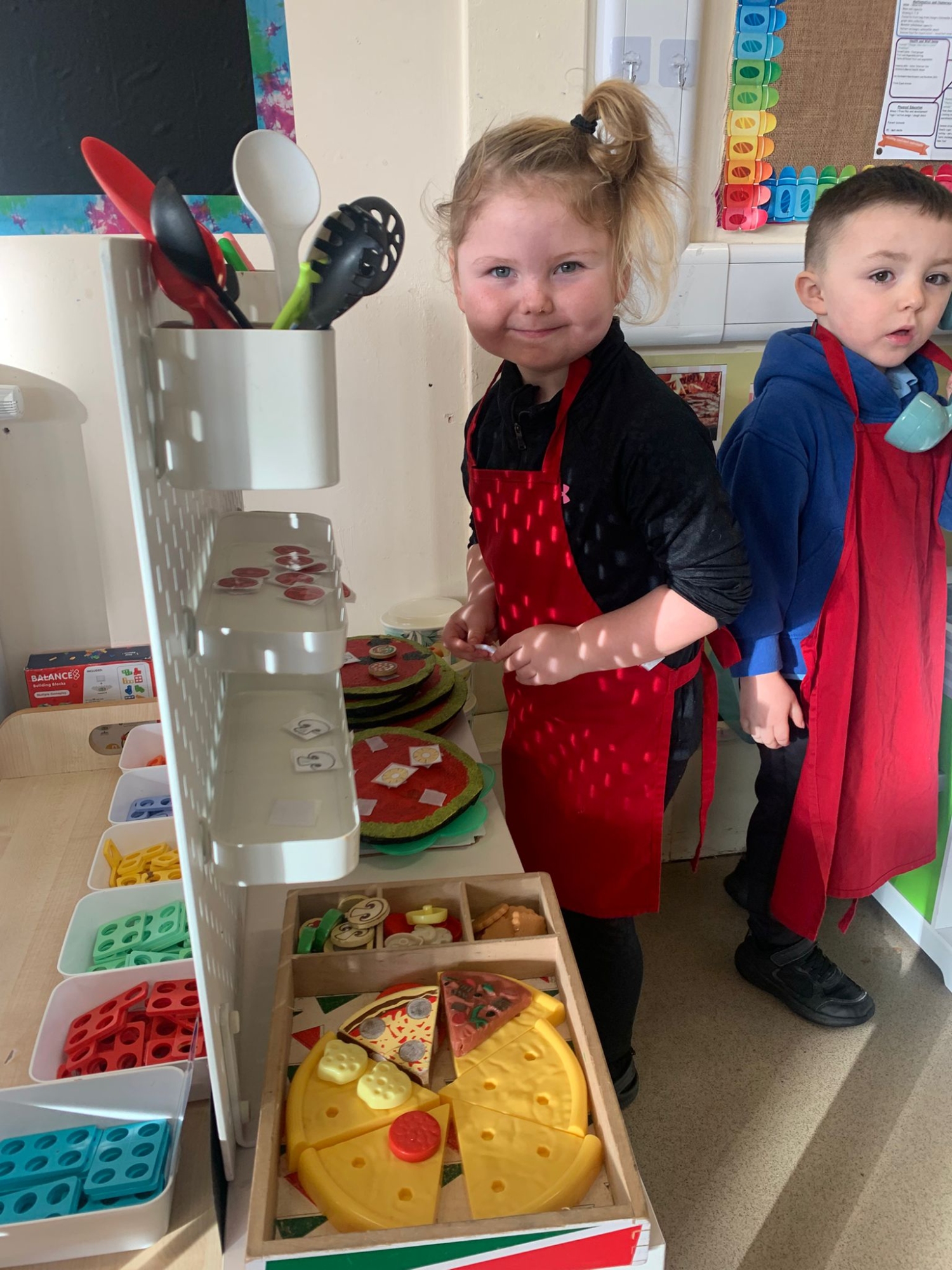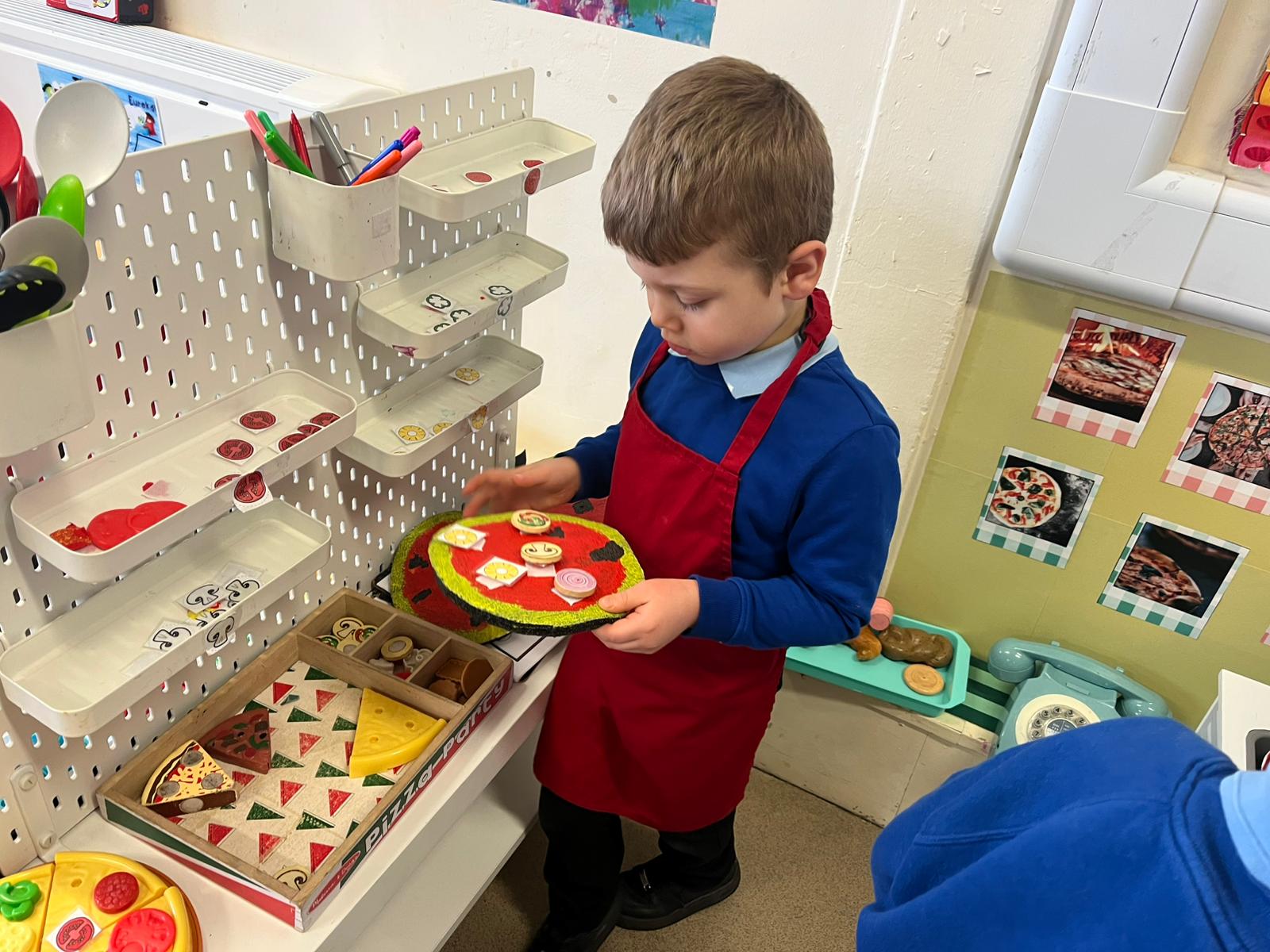We made our own Pizza restaurant role play in class. We decided what roles we would be – a chef, a customer, a delivery driver or a server.