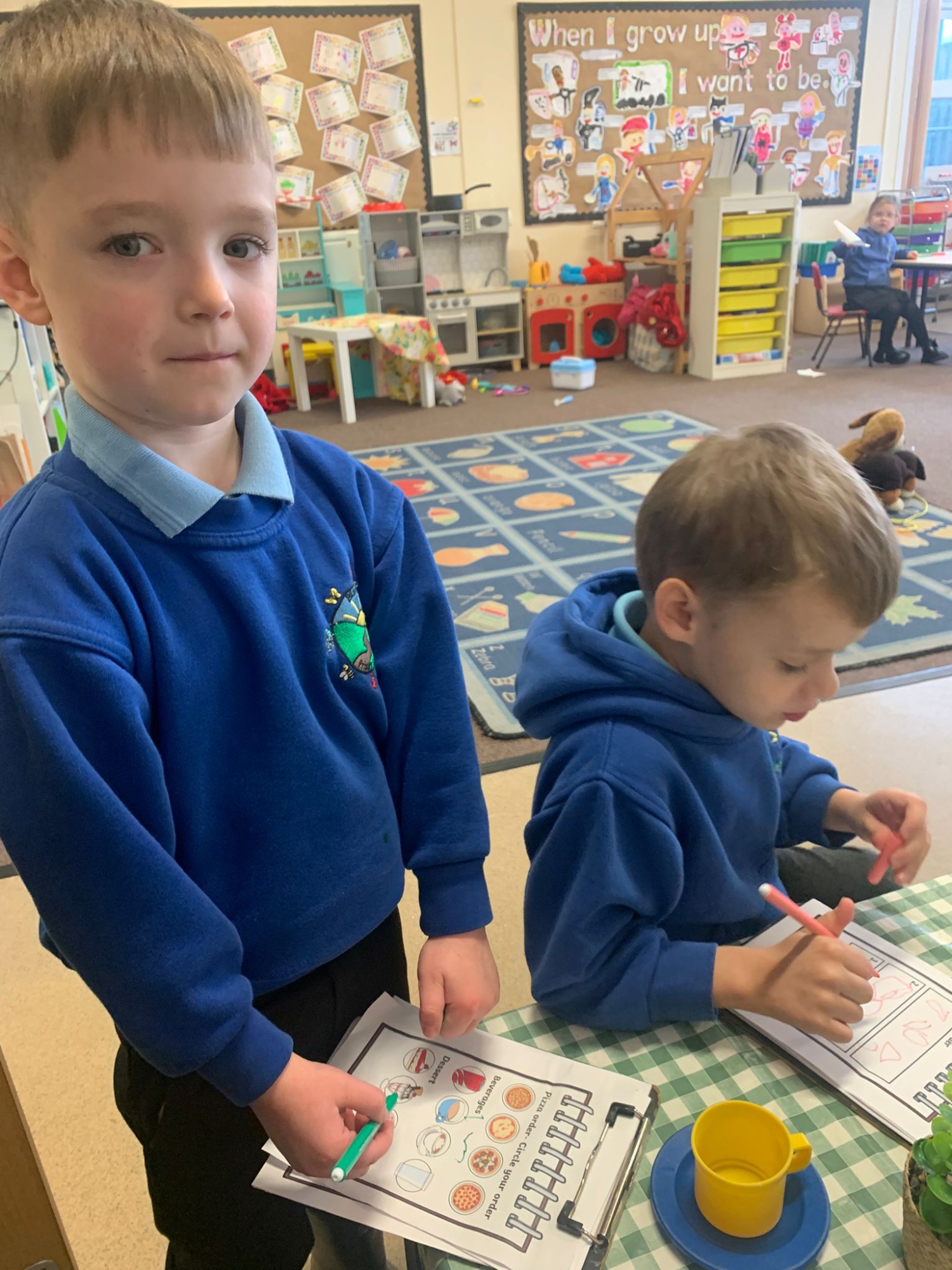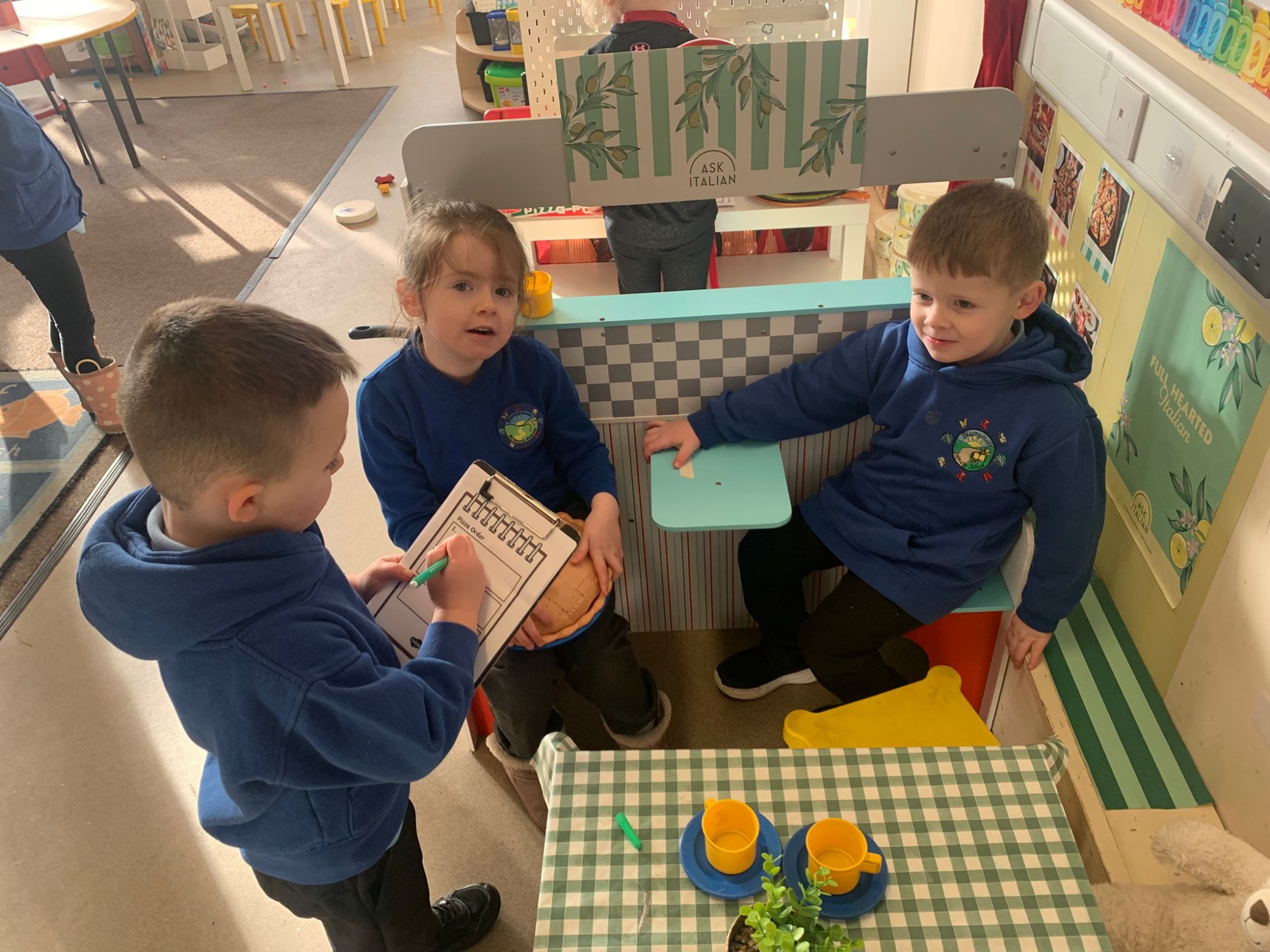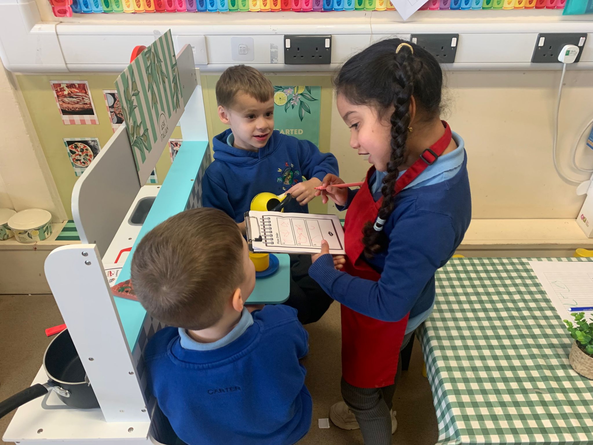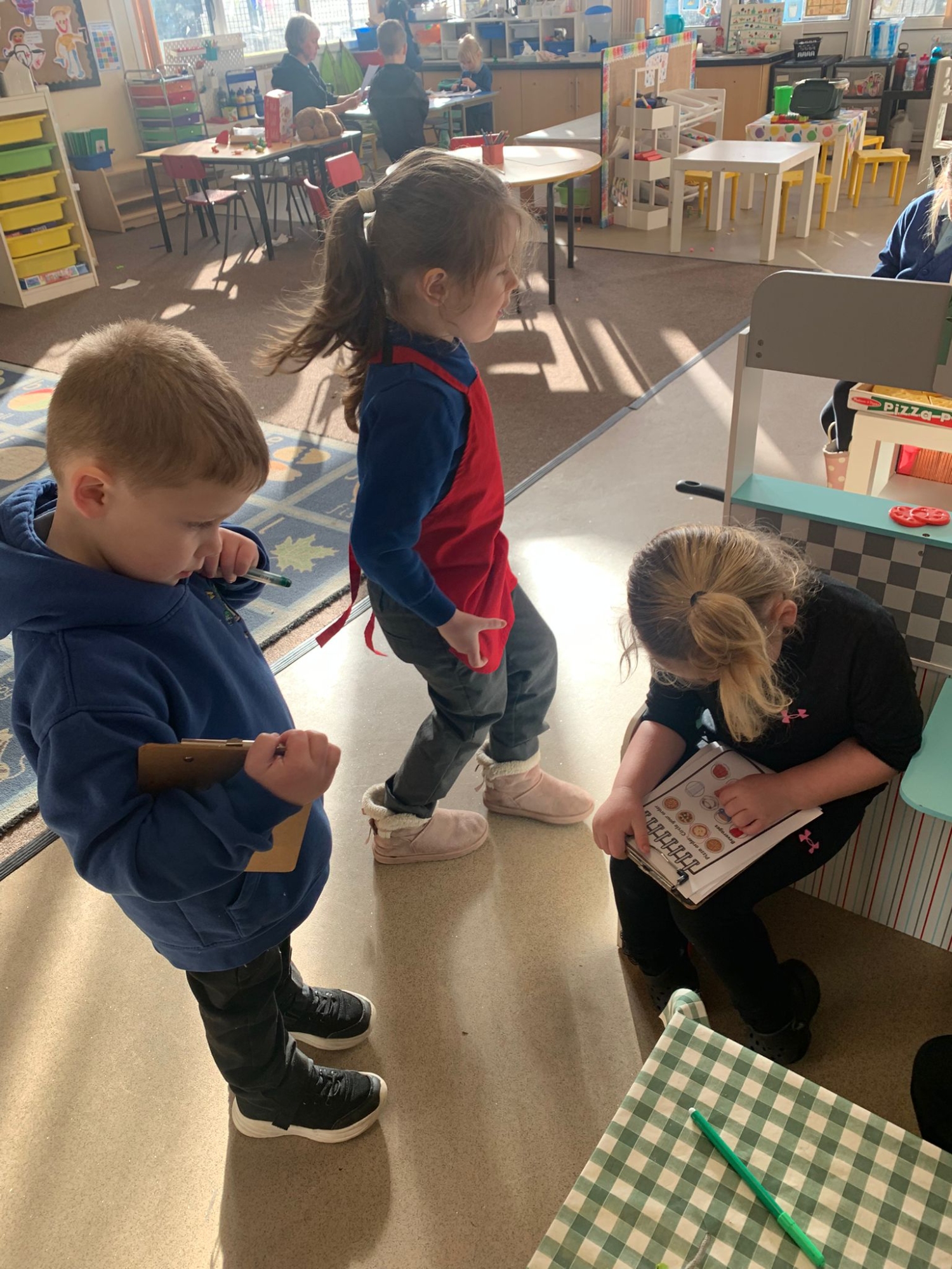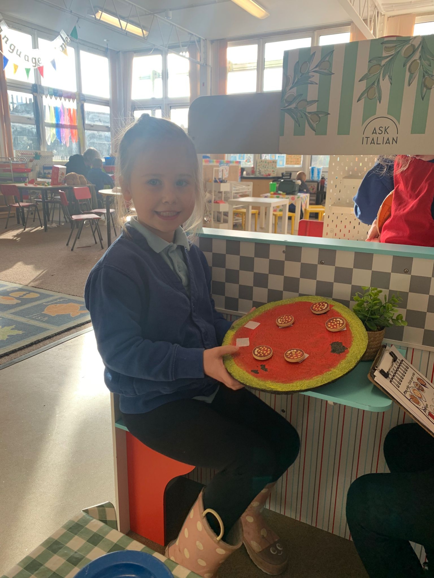 We made our own Pizza restaurant role play in class. We decided what roles we would be – a chef, a customer, a delivery driver or a server.