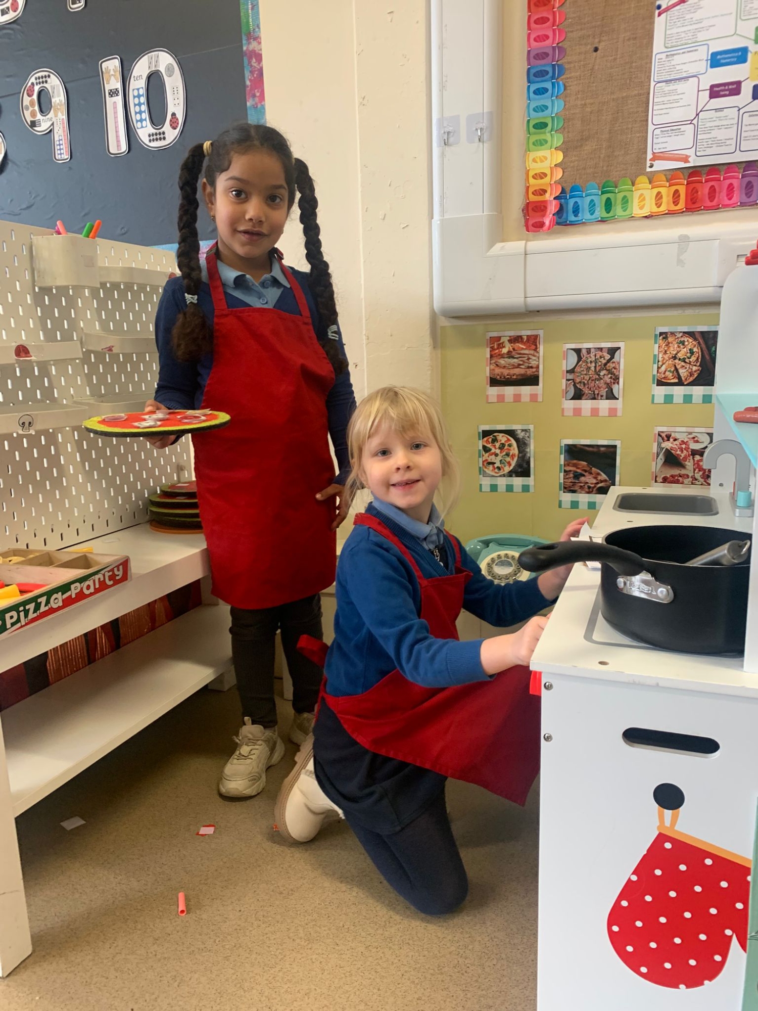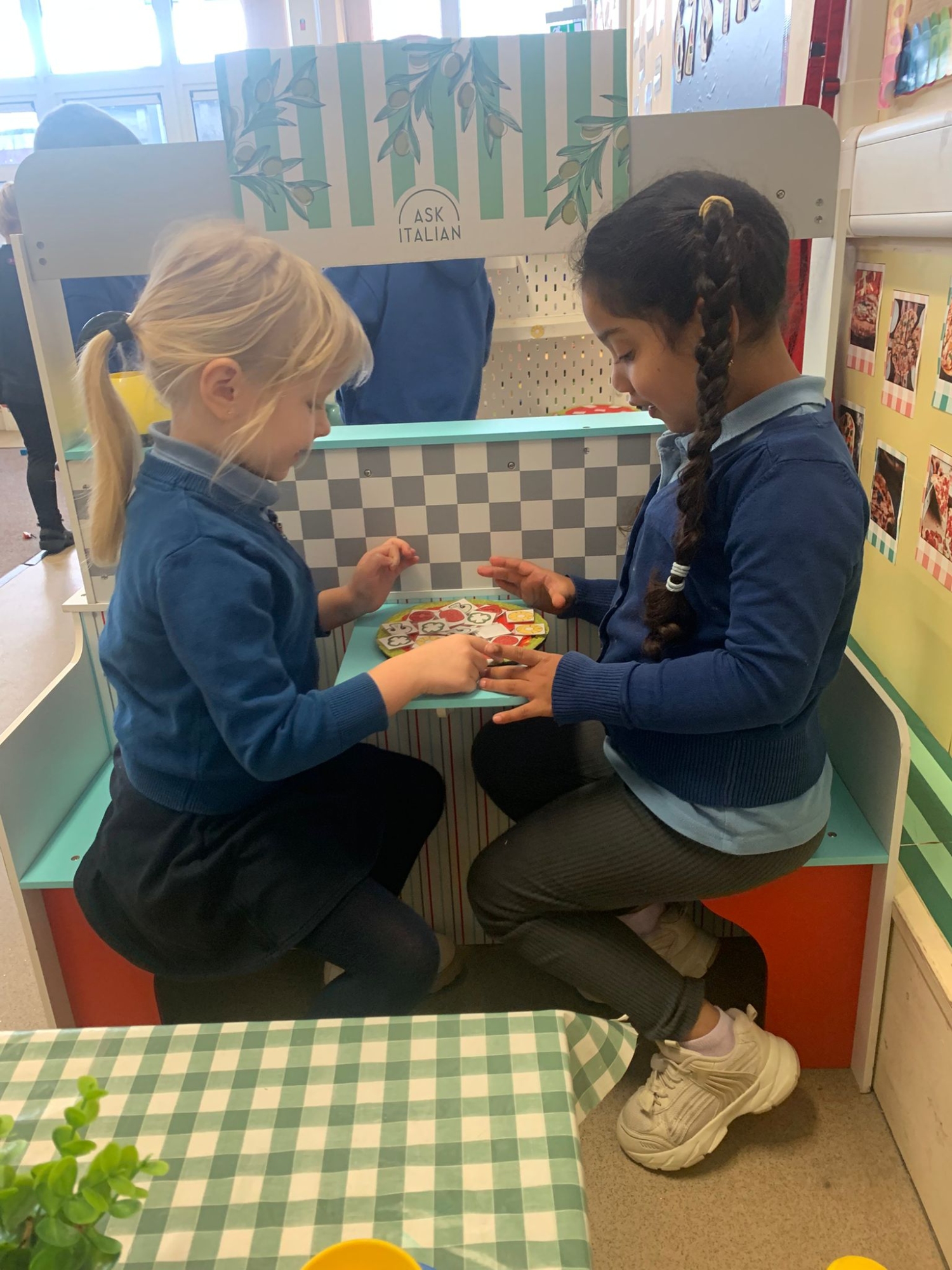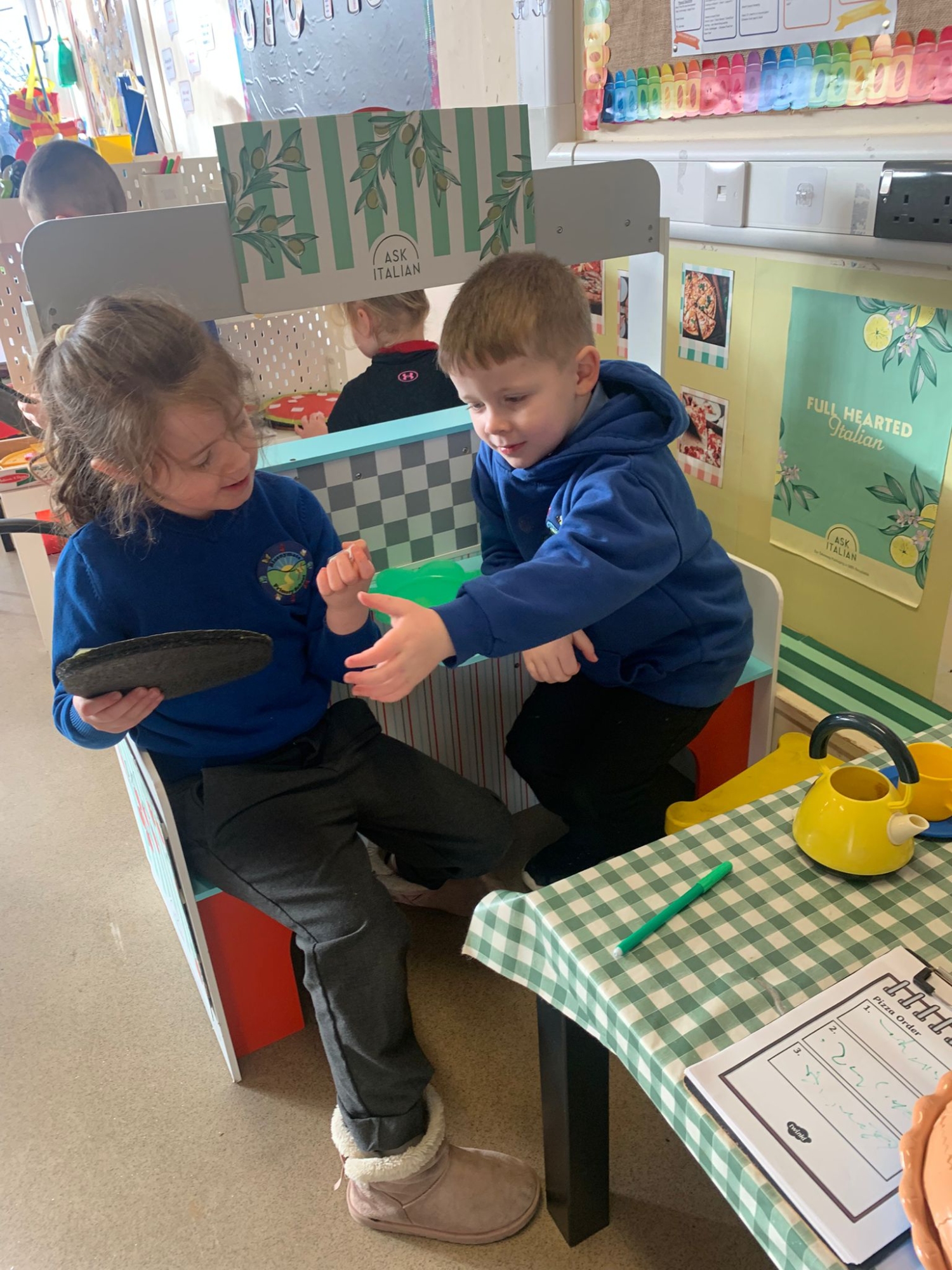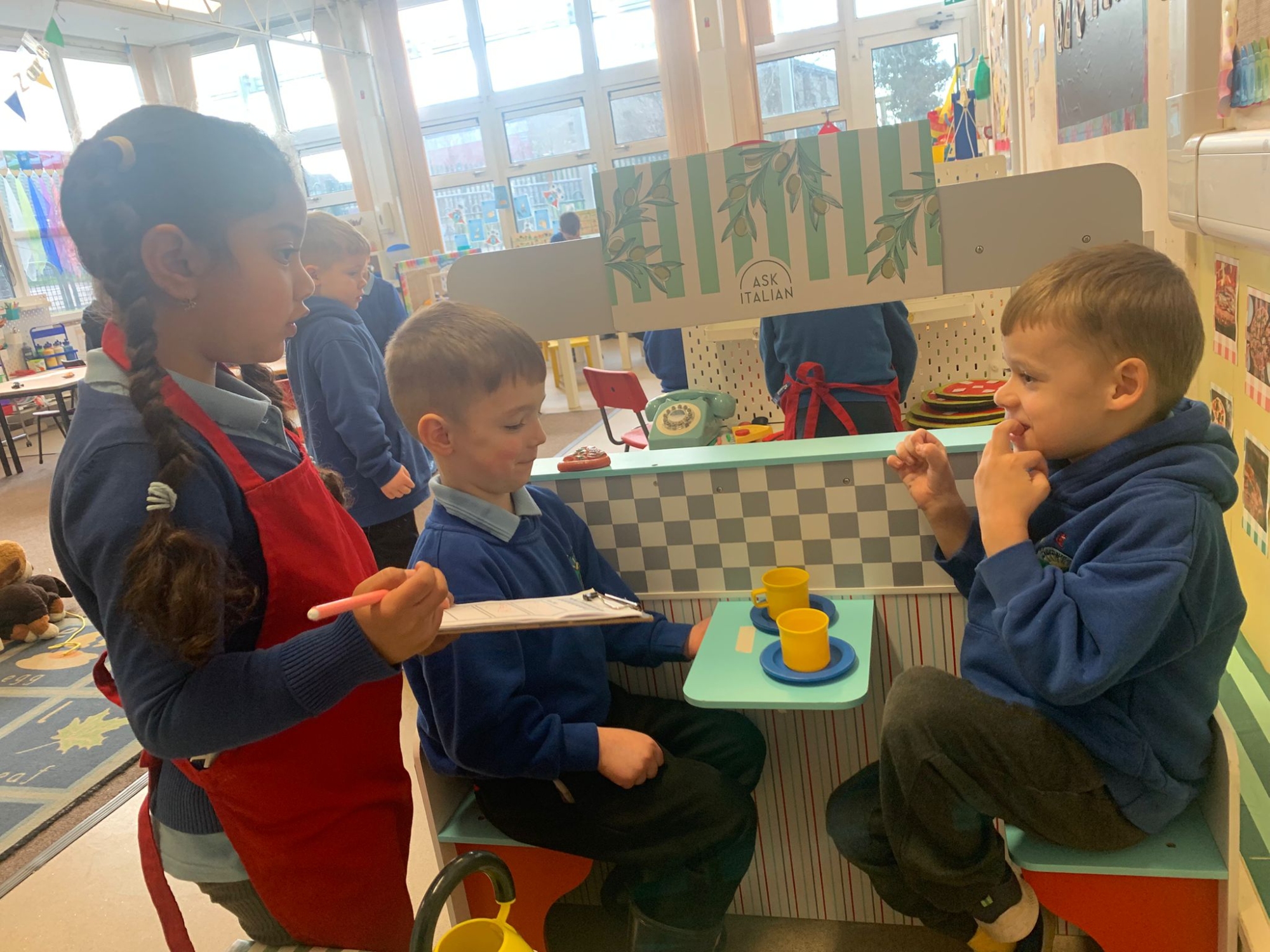 We made our own Pizza restaurant role play in class. We decided what roles we would be – a chef, a customer, a delivery driver or a server.