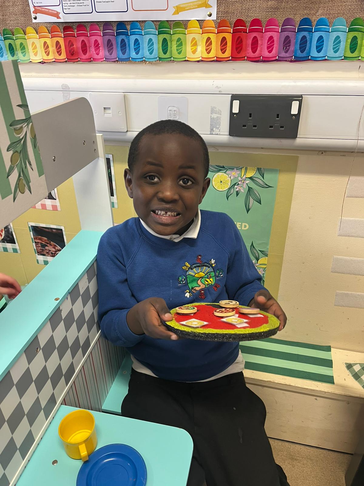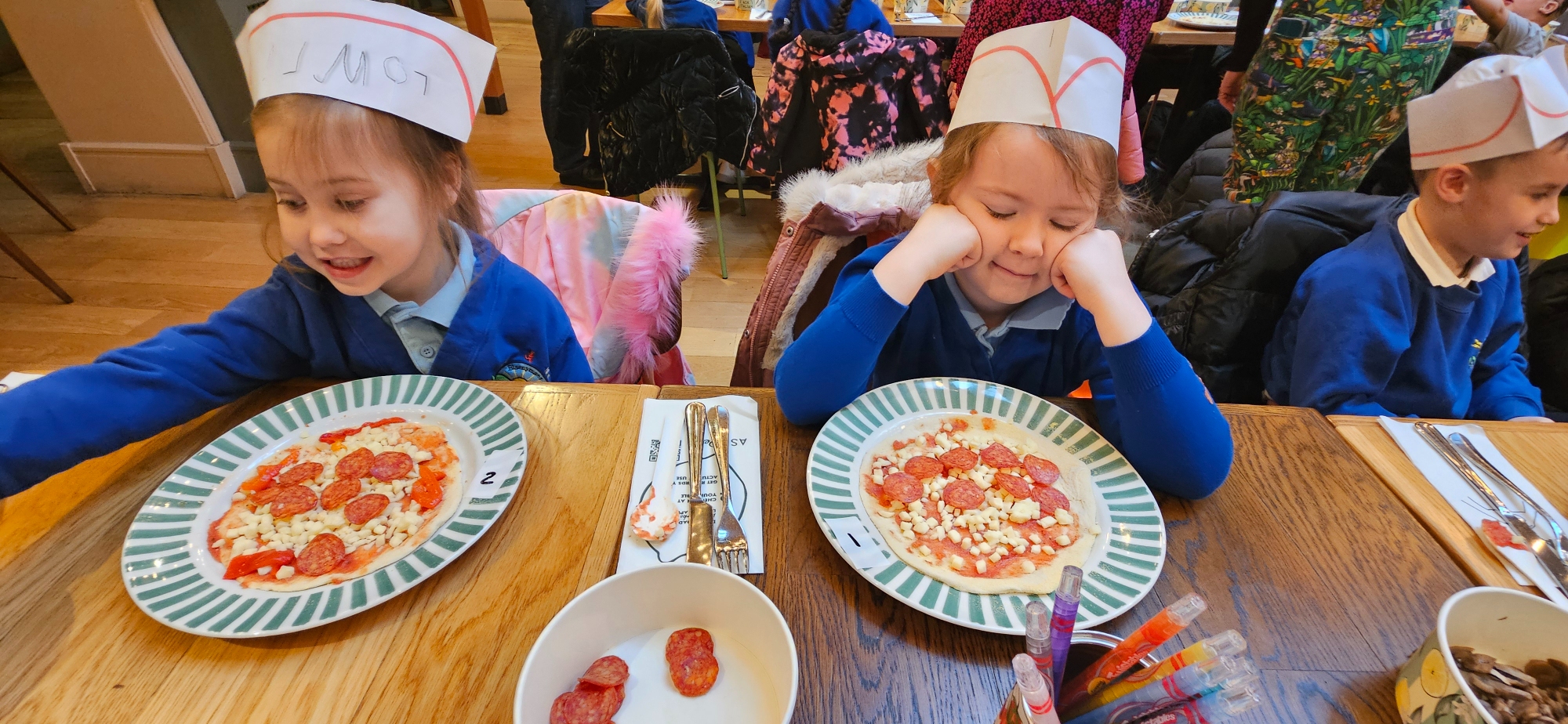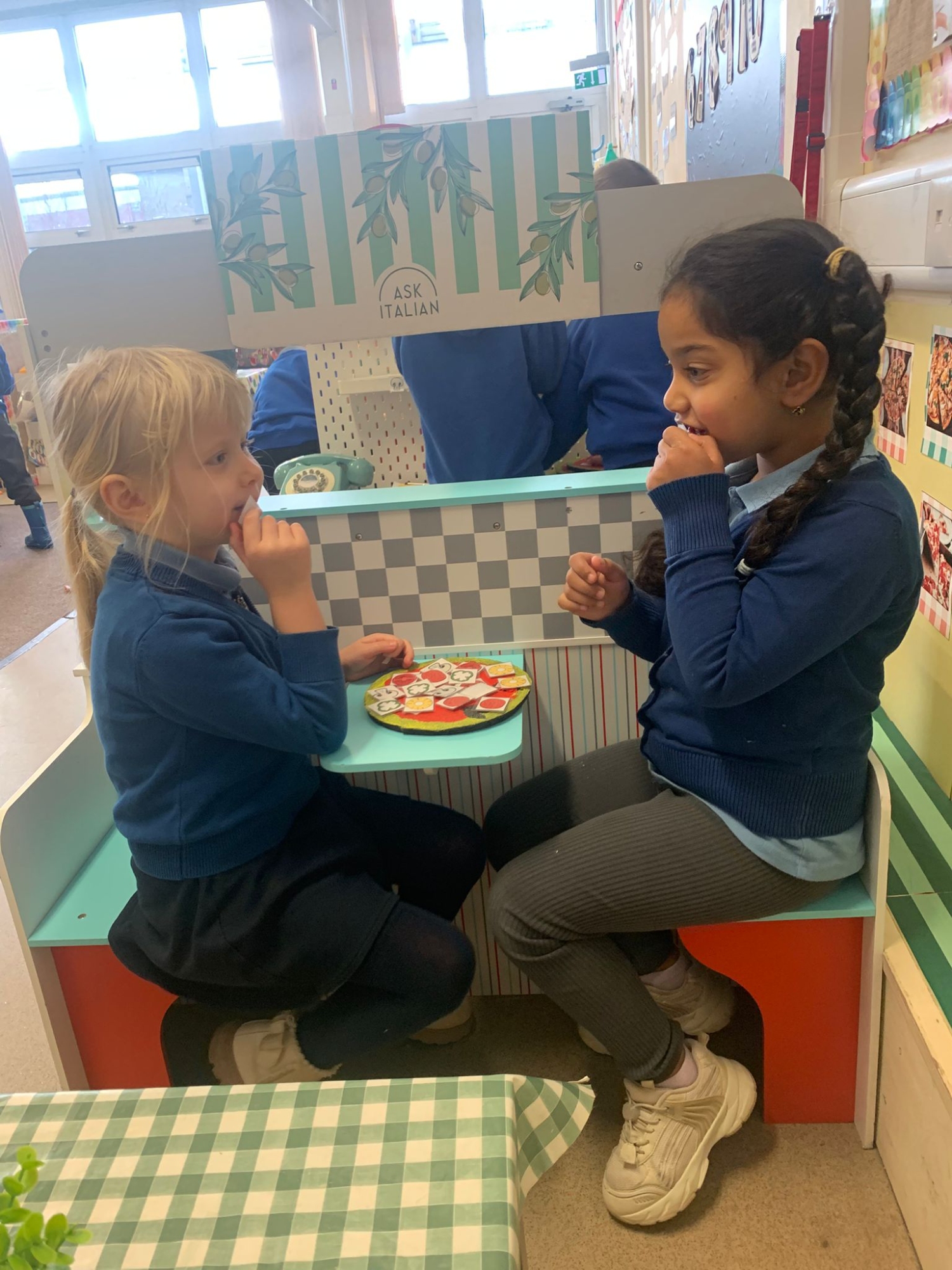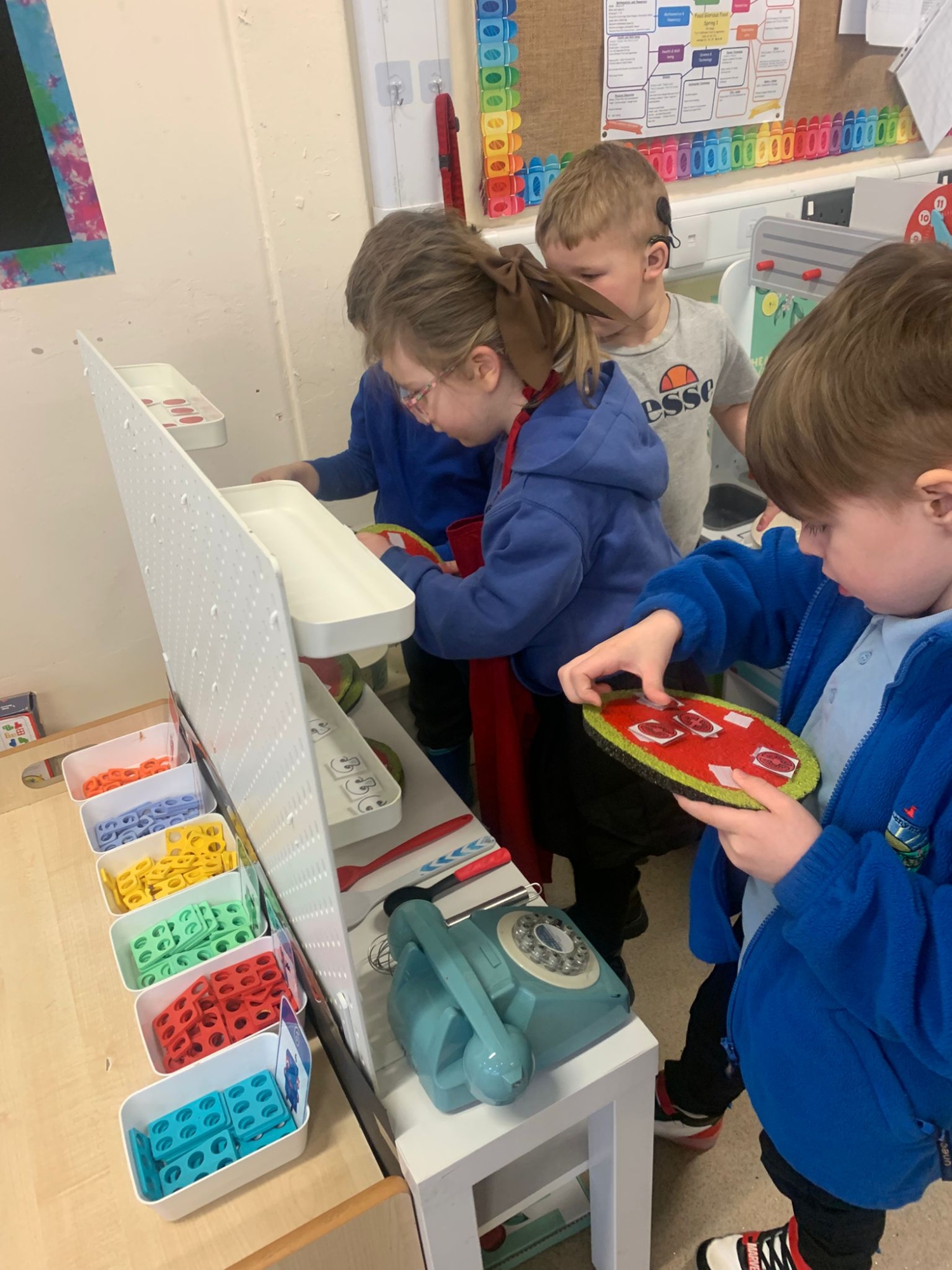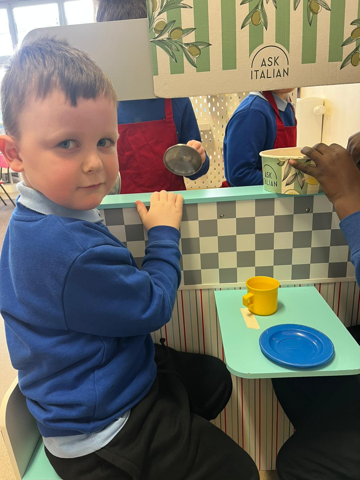 We made our own Pizza restaurant role play in class. We decided what roles we would be – a chef, a customer, a delivery driver or a server.