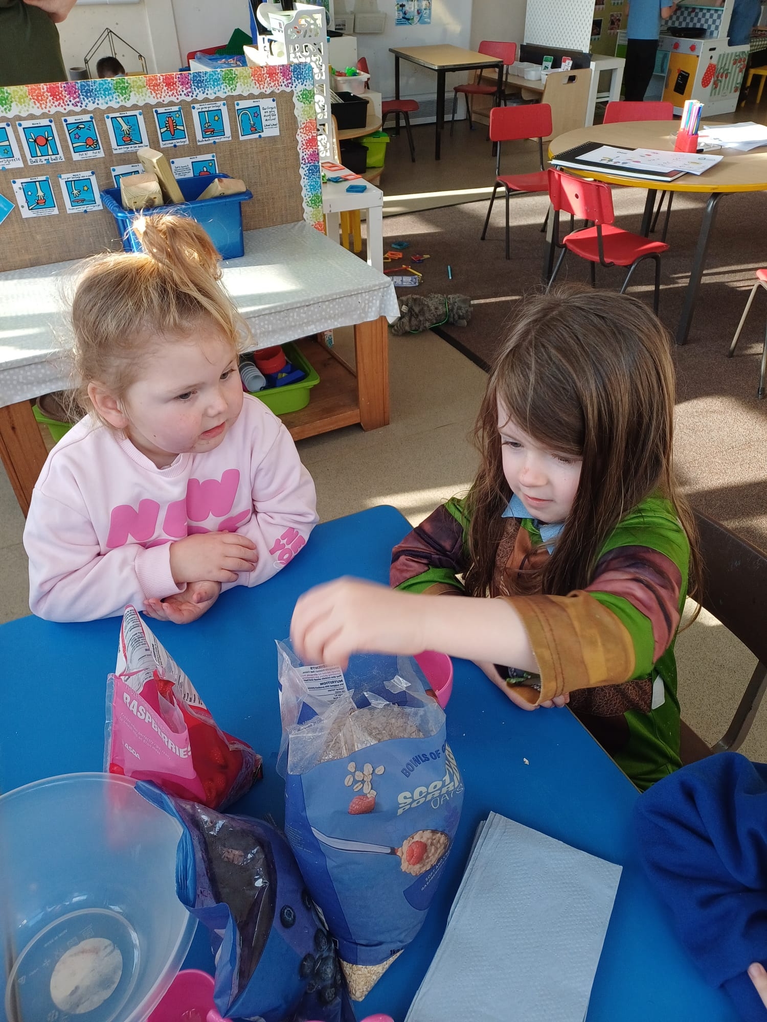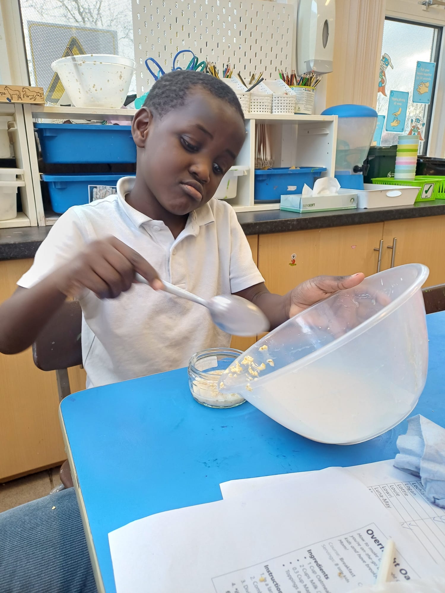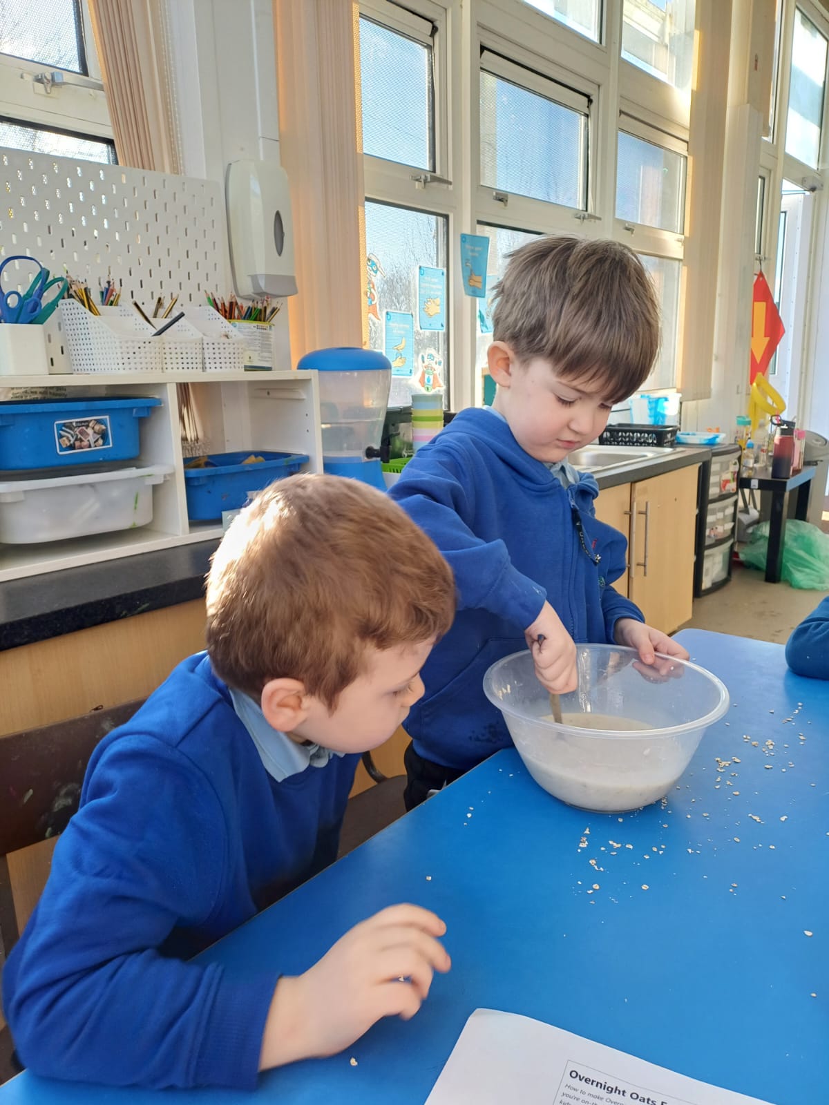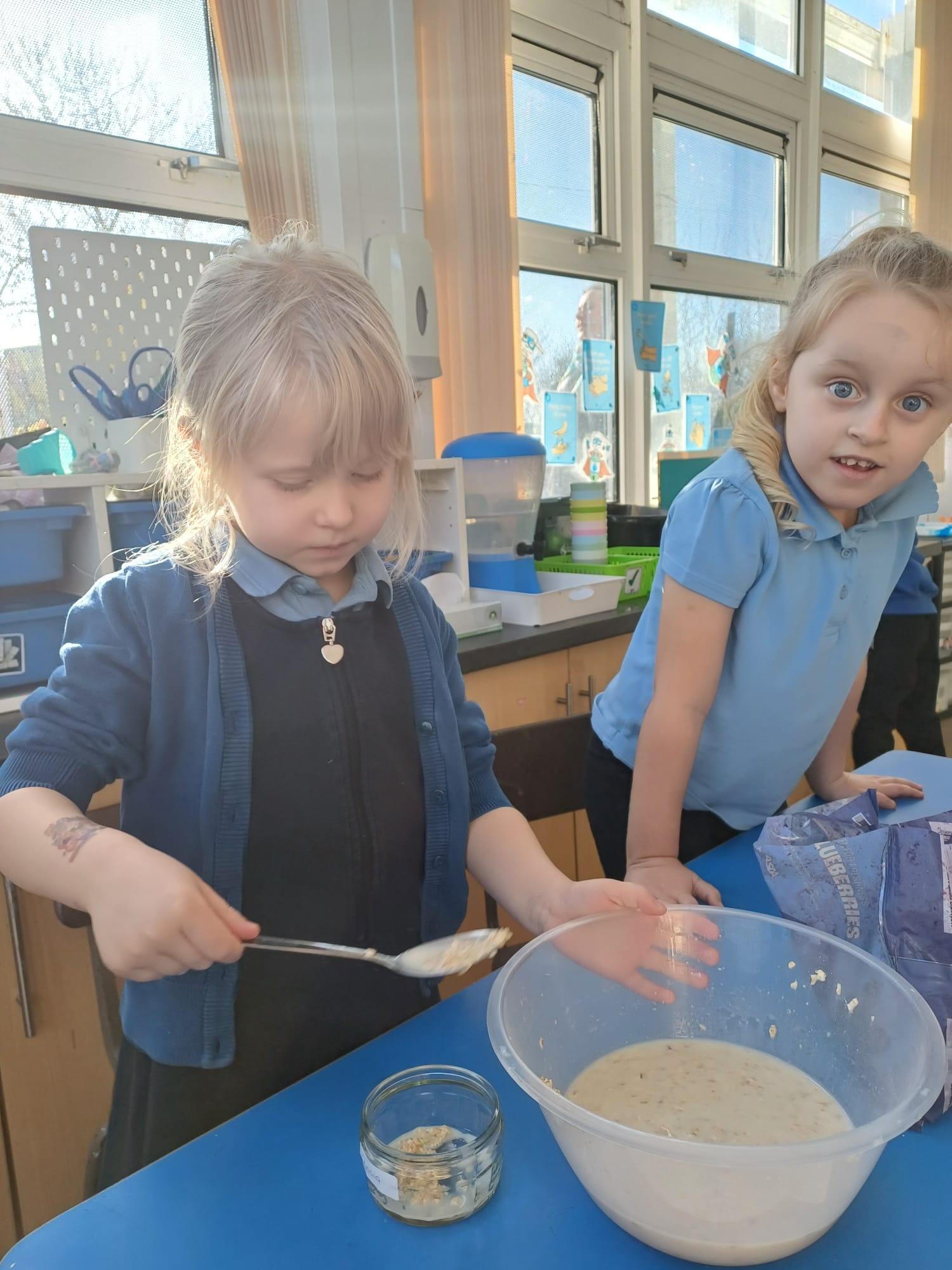 We talked about different meals and how different foods keep us strong and healthy. We planned a class big breakfast by choosing healthy foods and making overnight oats to try.
