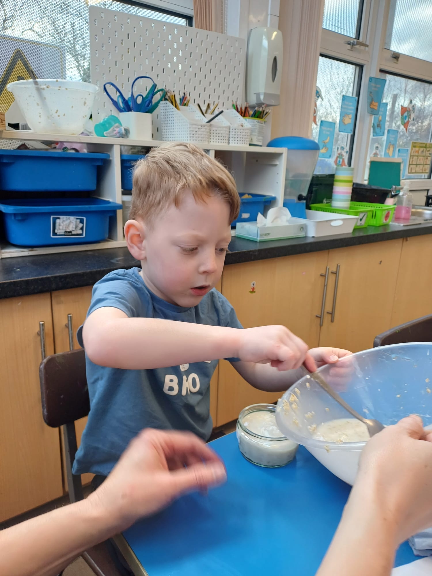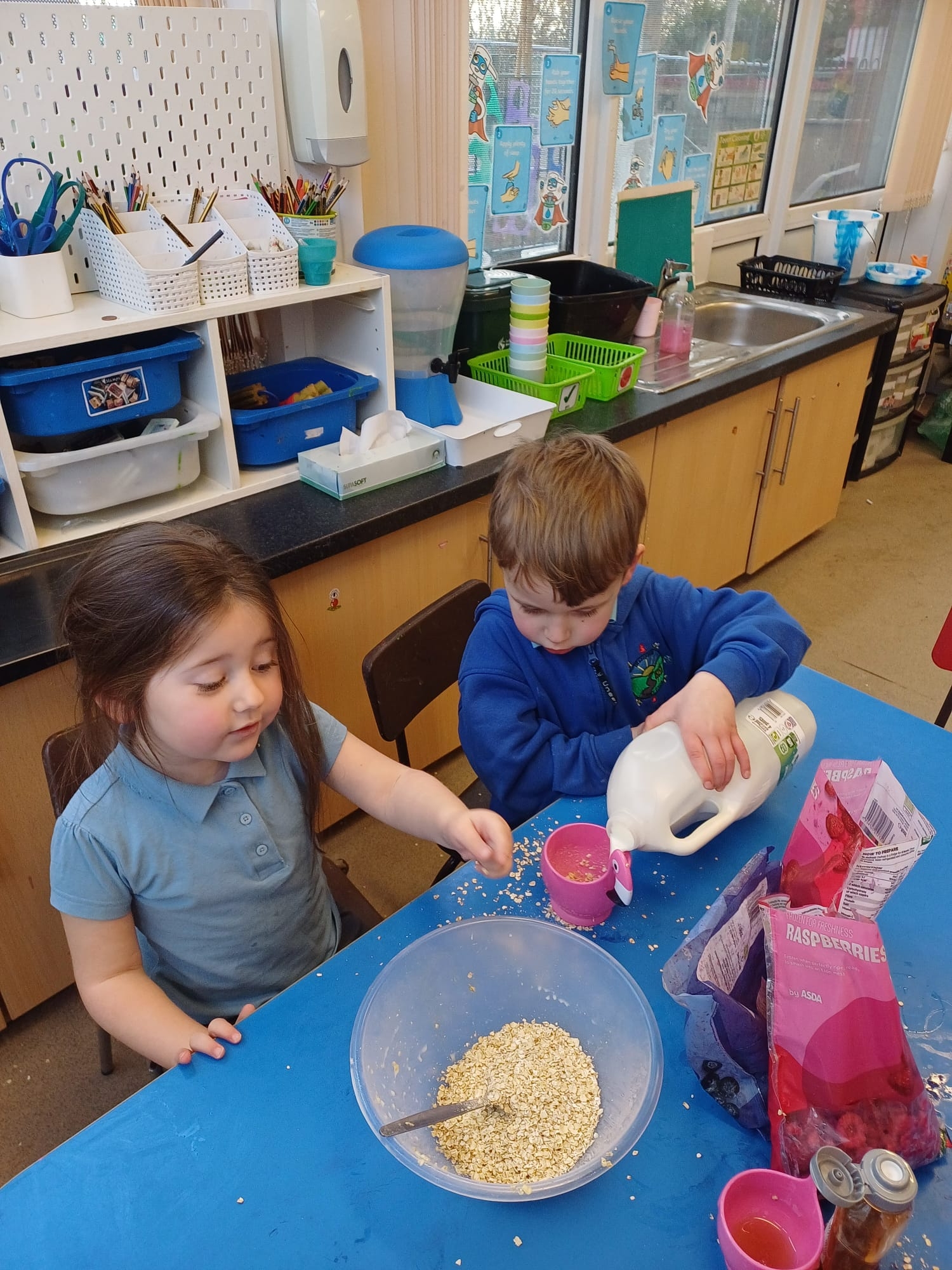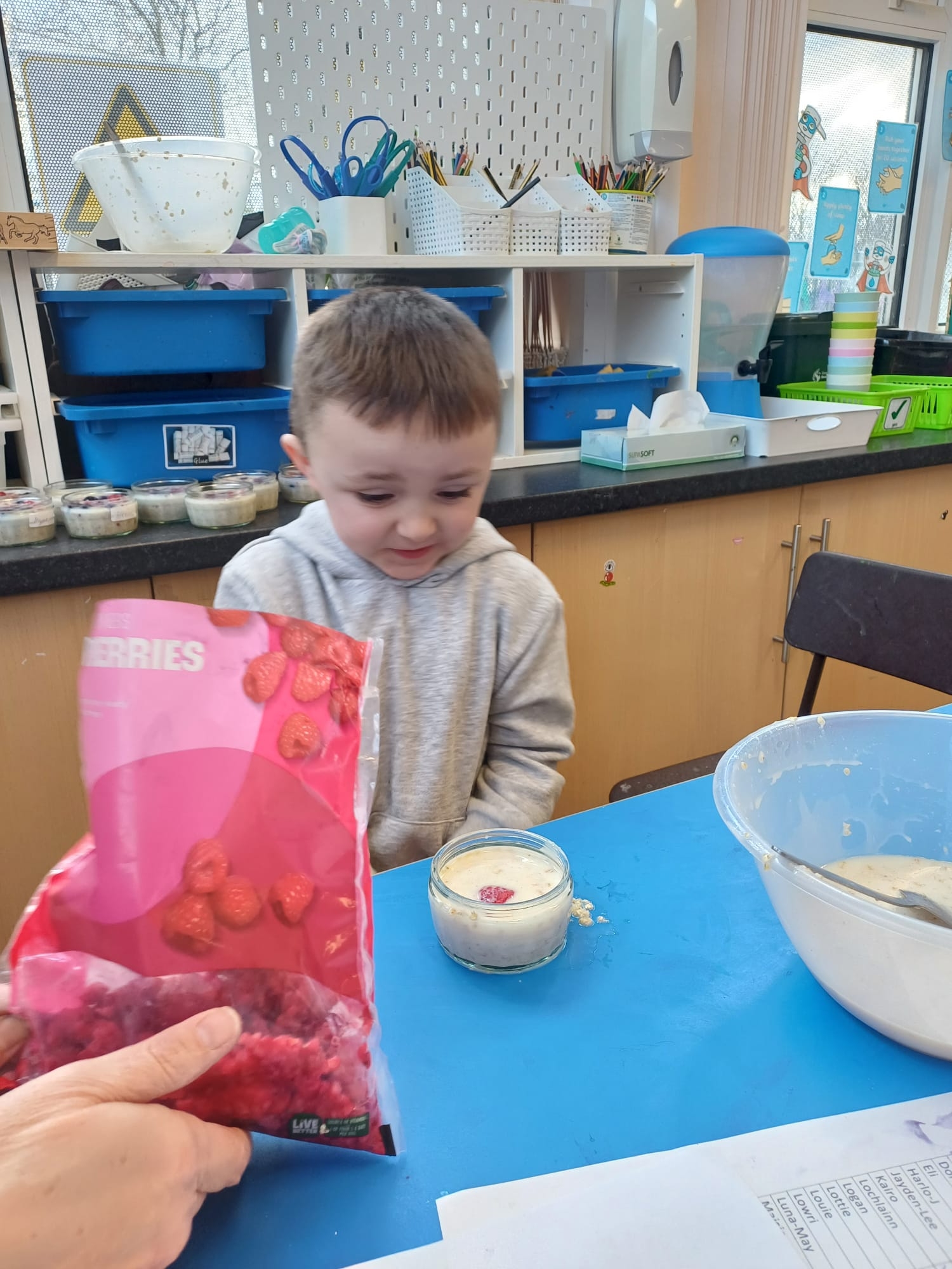 We talked about different meals and how different foods keep us strong and healthy. We planned a class big breakfast by choosing healthy foods and making overnight oats to try.
