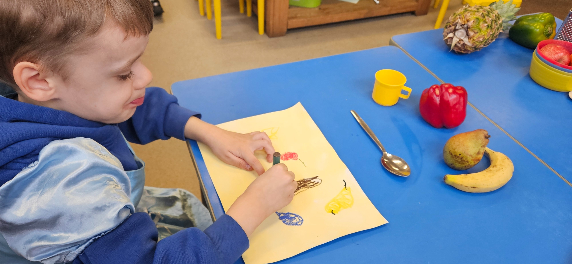 We made hungry caterpillar silly soup! We had to find the words that rhyme with foods from the story.