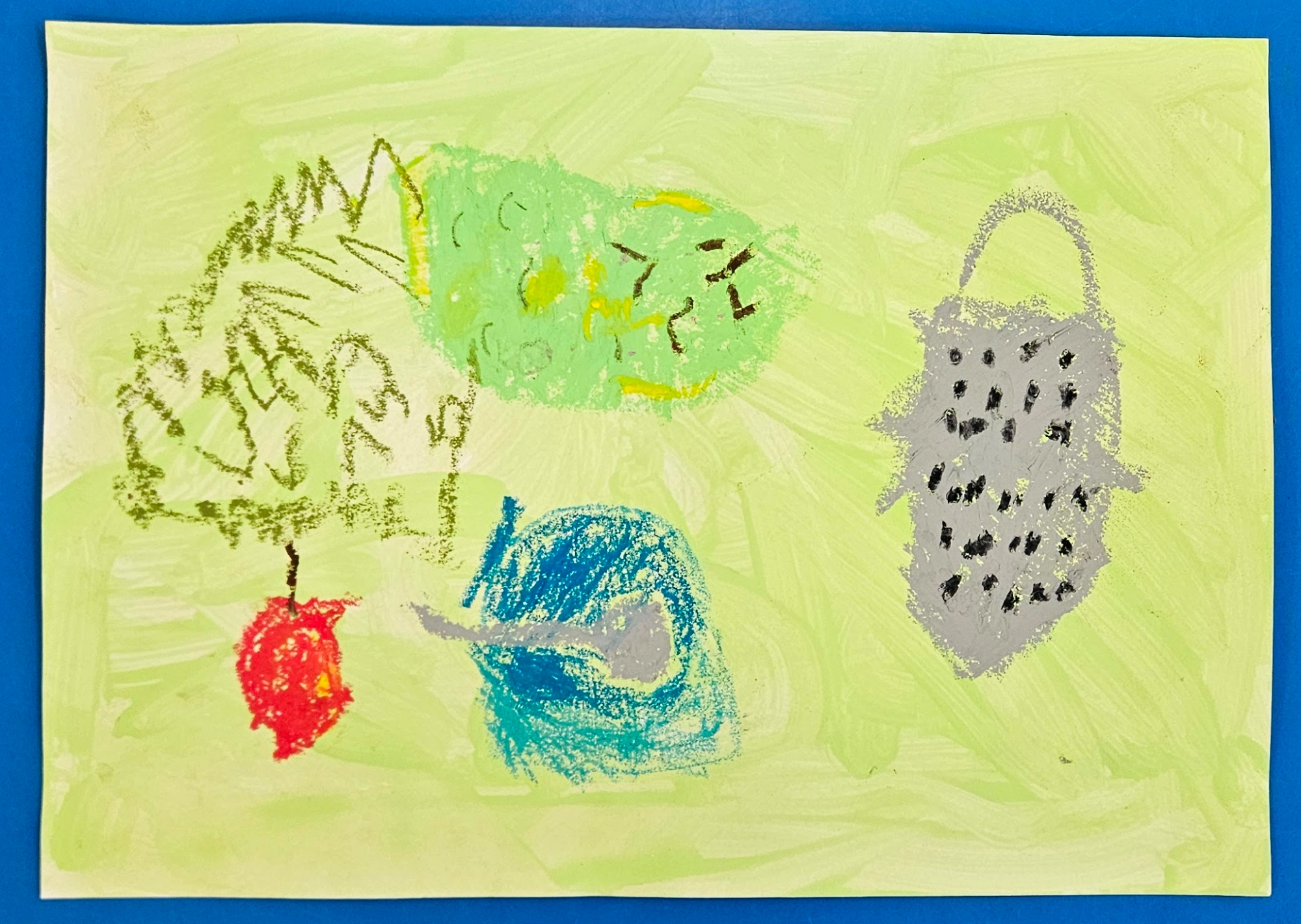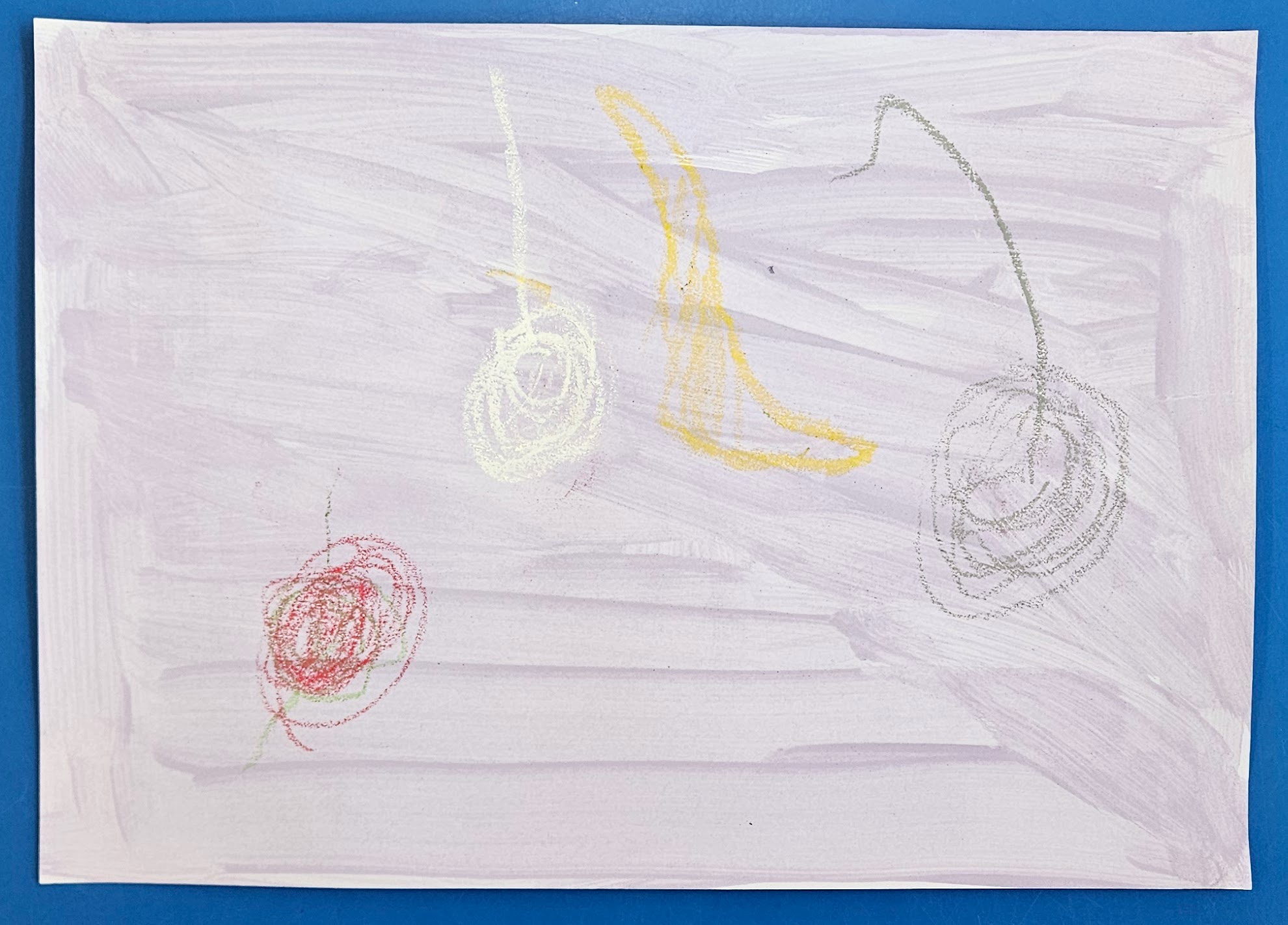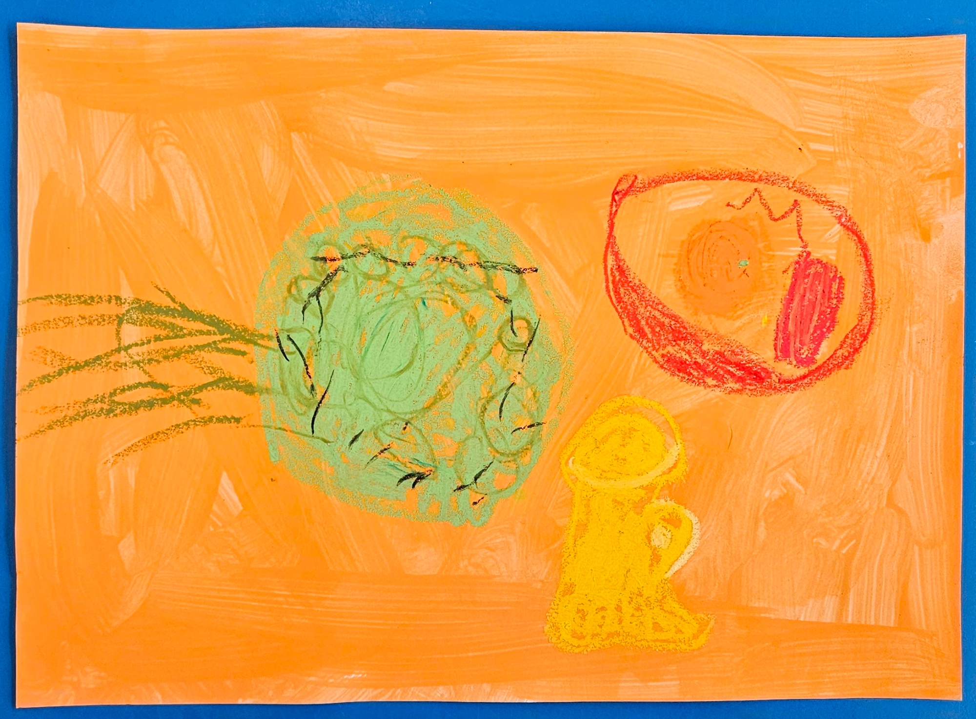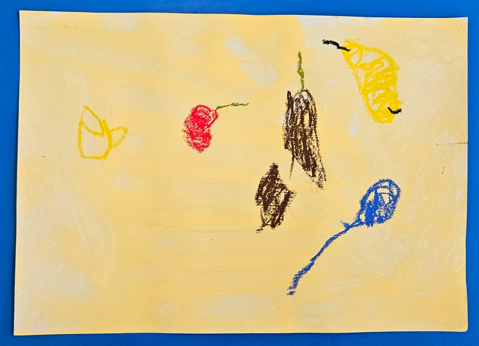 We made our own by choosing which colour paint we wanted for our background and then deciding what objects we wanted in our work. We then used oil pastels to draw them.